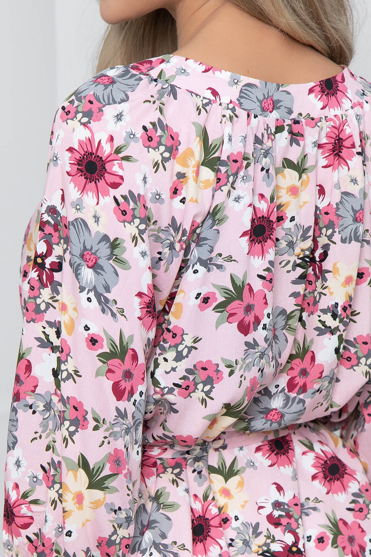 Очаровательная лёгкая блуза свободного кроя с завязками на талии, которые придадут образу изысканности. Округлый вырез горловины. Рукав втачной, три четверти, на манжете.