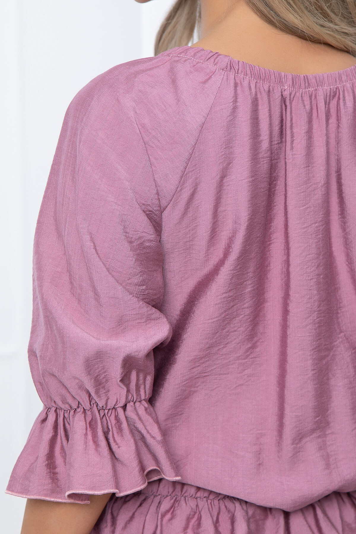 Блуза в модном оттенке - это отличная возможность проявить свою женственность. Рукав три четверти, по низу украшен воланом. Само изделие так же украшено по низу воланом, что придает образу легкости и воздушности. Горловина отработана резинкой, это позволяет спустить блузу на плечи, что придаст образу кокетства. Отлично будет смотреться как с брюками, так и с джинсами.