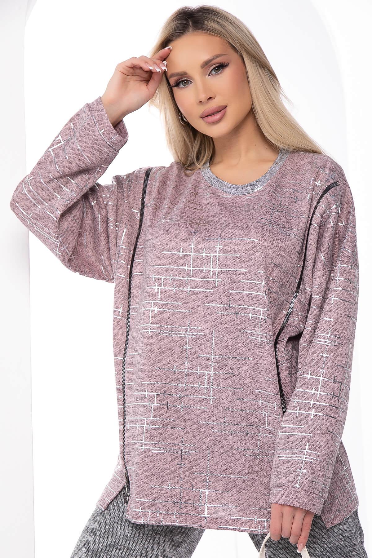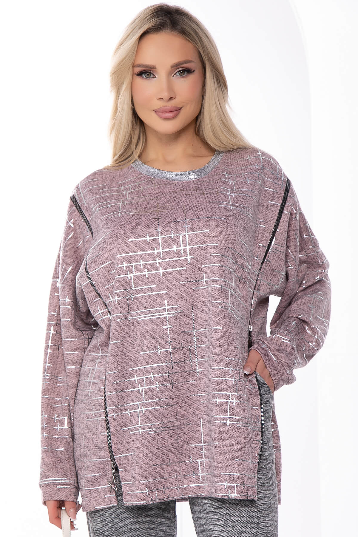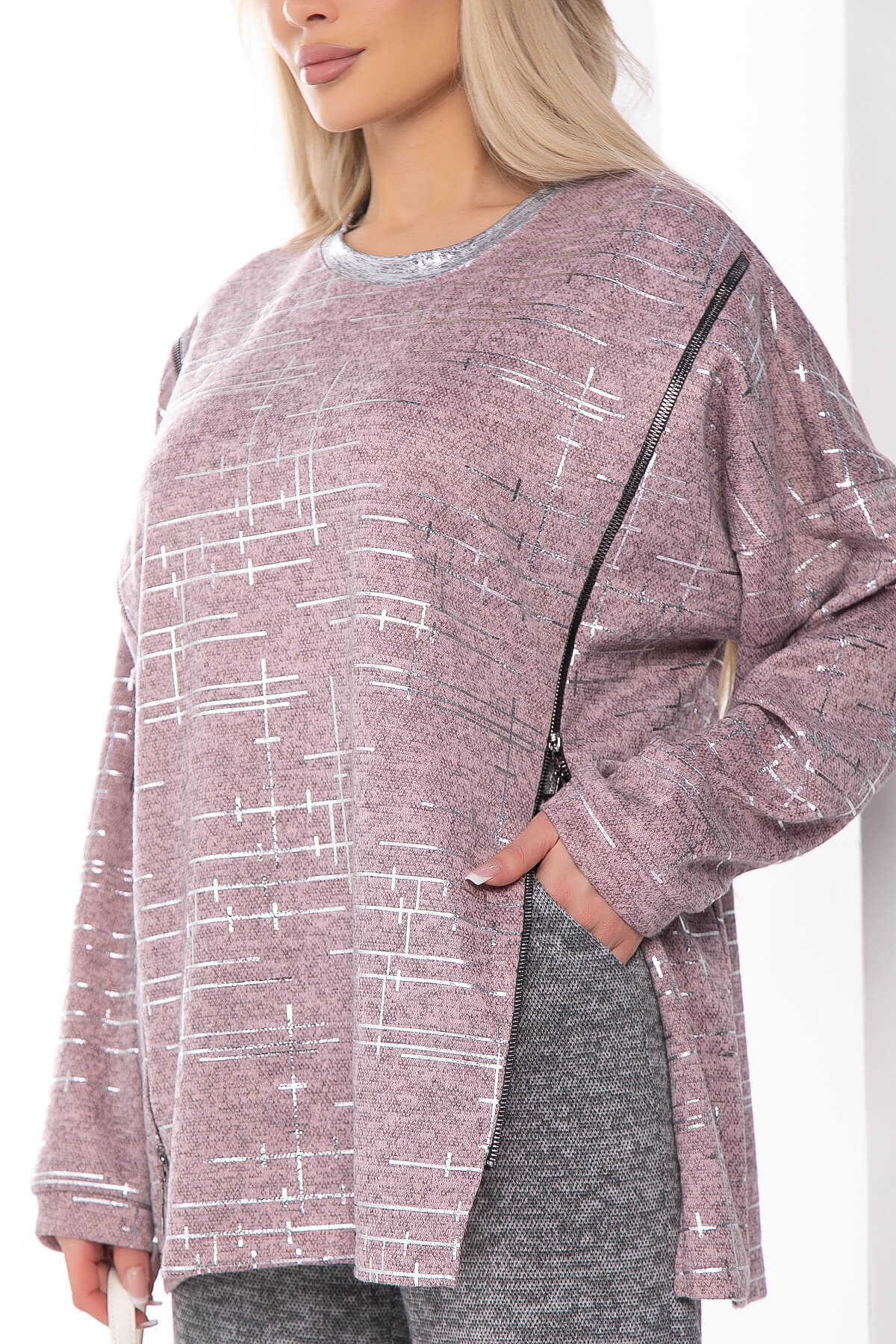 Комфортный и практичный джемпер с функциональными замками по бокам. Округлый вырез акцентирован серебристой горловиной. Длинный рукав со спущенной линией плеча. Такой трикотажный джемпер отлично будет смотреться как с джинсами, так и с брюками. Свободный крой позволит чувствовать себя уютно на прогулке, не сковывая ваших движений.