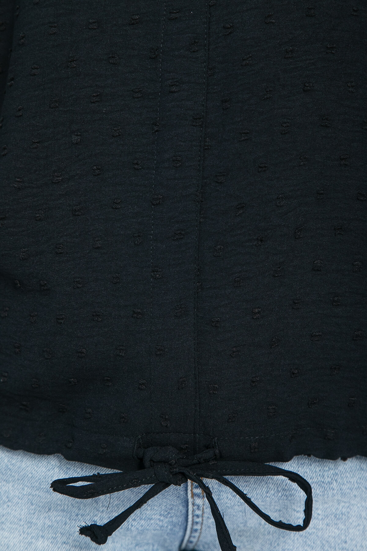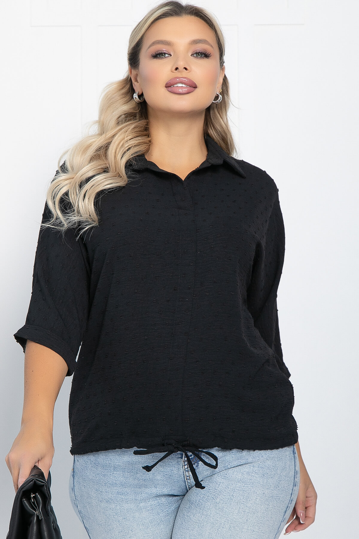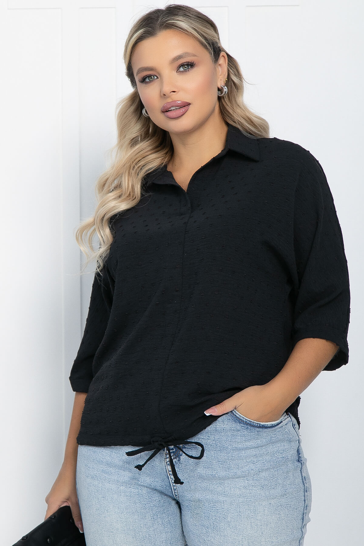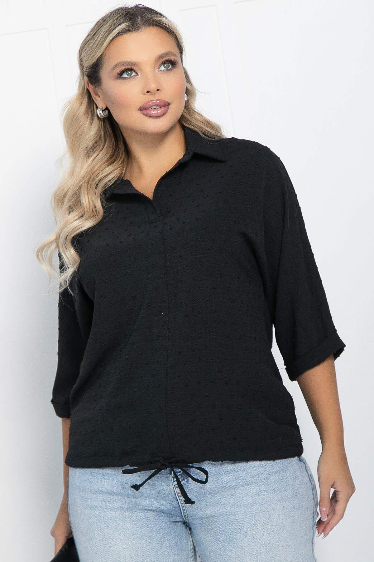 Стильная туника подойдёт для создания повседневных образов. Модель имеет классический черный цвет, который является универсальным базовым цветом для повседневного и делового гардероба. Рукав цельнокроеный, длина 3/4, по низу манжет. Воротник рубашечного типа на стойке. По низу изделия шнурок из основной ткани.