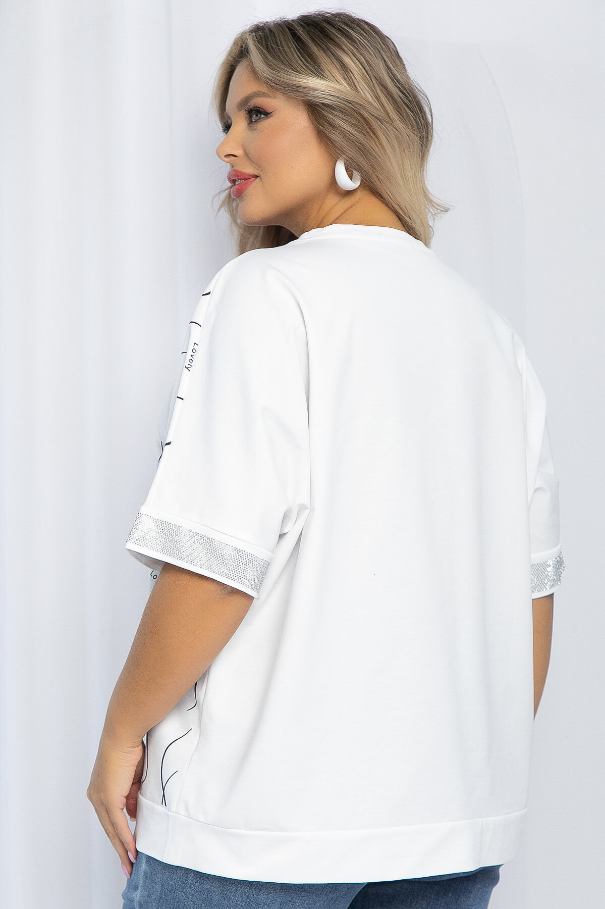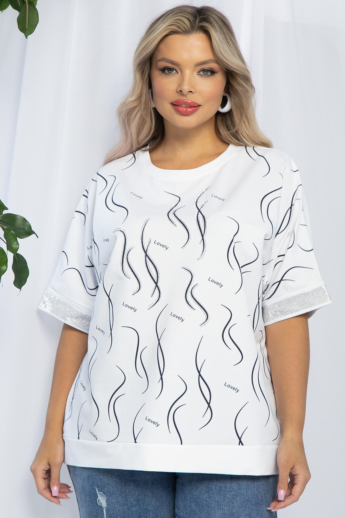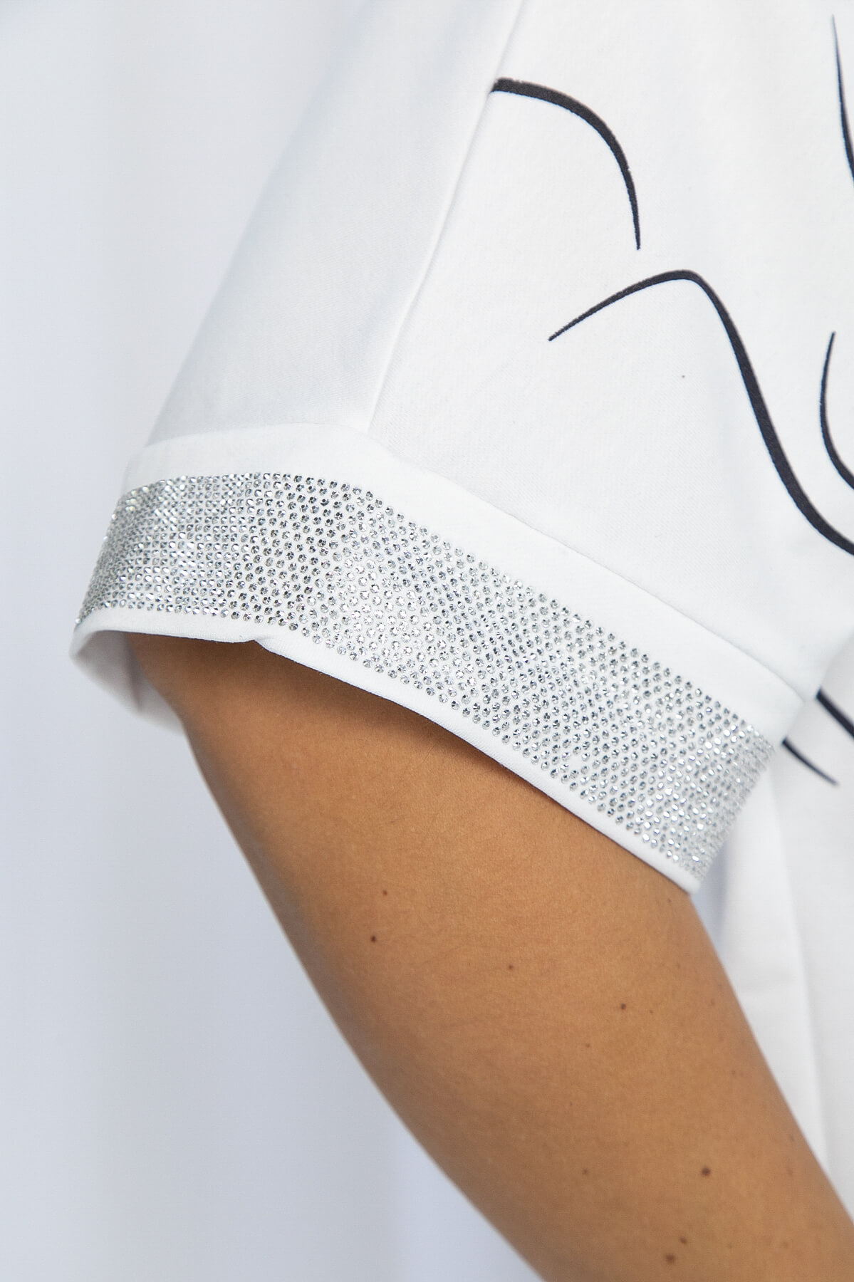 Оверсайз крой этой футболки создаёт ощущение комфорта и лёгкости, позволяя чувствовать себя уверенно в течение всего дня. Футболка украшена оригинальным принтом и дополнена стразами, что делает её поистине неповторимой.