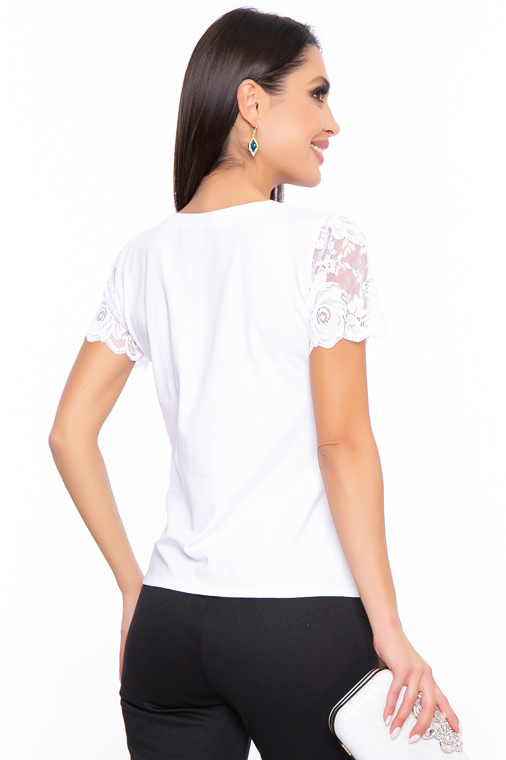 - V-образный вырез горловины, рукав короткий, втачной, выполнен из гипюра в тон;