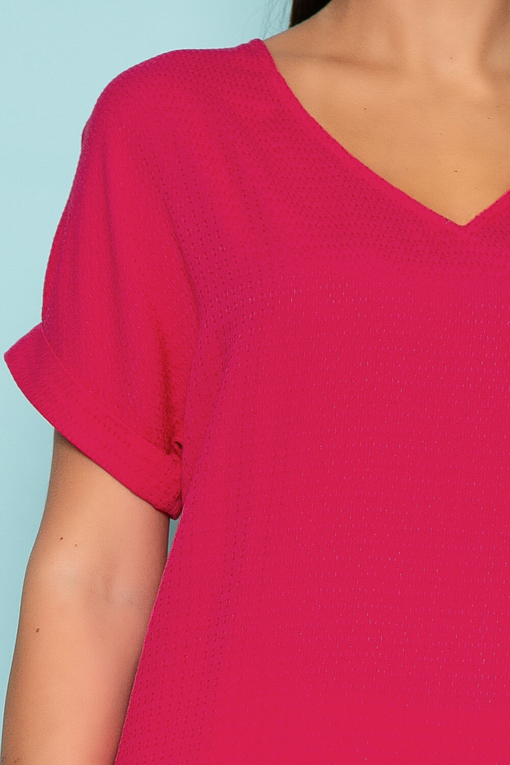 Блуза из хлопка с коротким рукавом в невероятном оттенке "Фуксия" с поясом из основной ткани. Блуза свободного силуэта, линия плеча спущена, на манжете. V-образный вырез горловины, без подкладки, низ ровный. Примерьте на себя яркие краски этого лета!