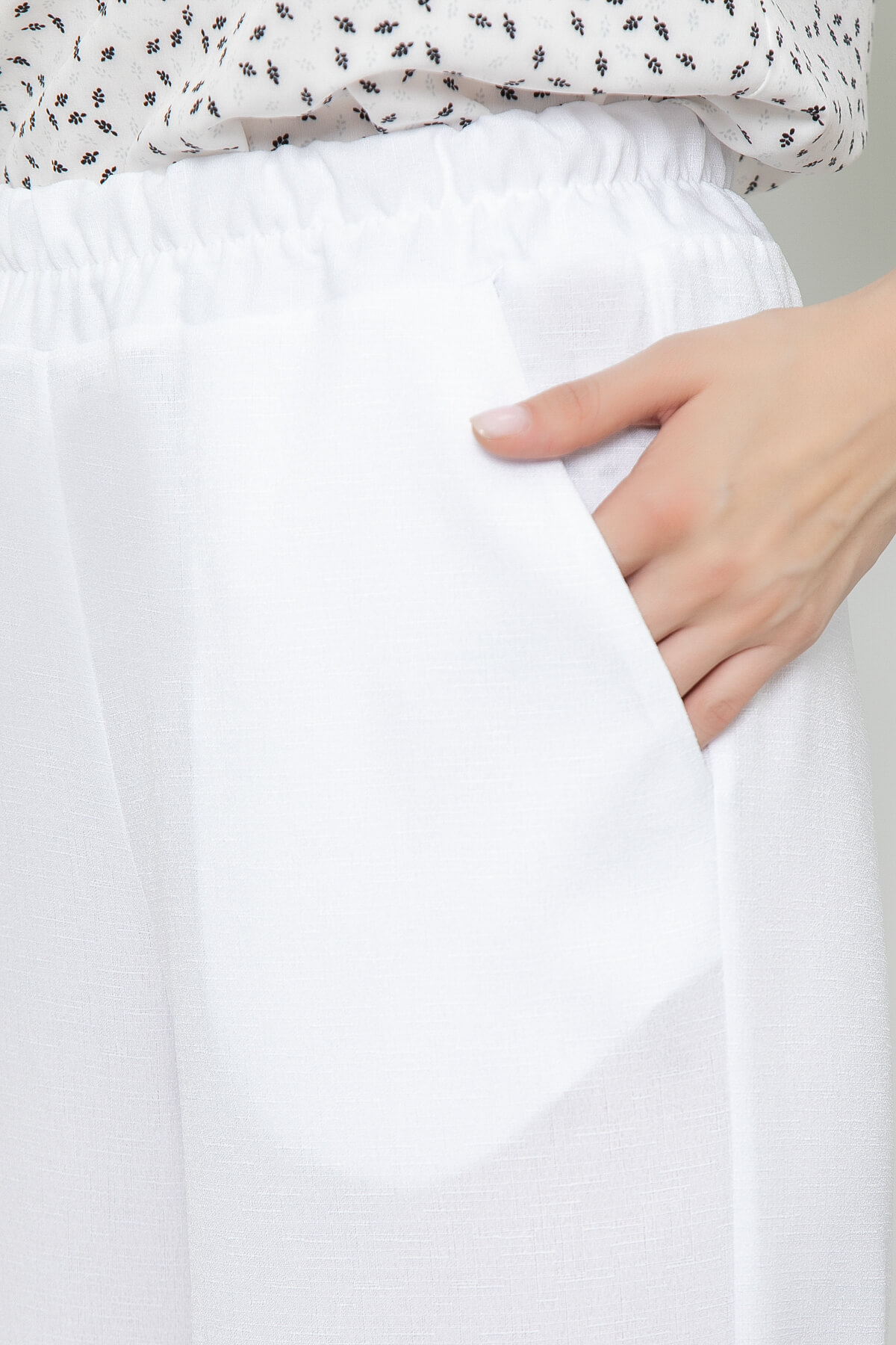Белые брюки для идеальных летних сочетаний. Красиво будут смотреться в тандеме с яркими джемперами, топами, блузами, а также в классических чёрно-белых цветовых решениях. Широкие и прямые брюки отлично скрывают недостатки фигуры - лишний вес, несовершенные формы. Они идеально подходят девушкам любой комплекции и любого возраста. По талии брюки на широкой резинке. Есть карманы.