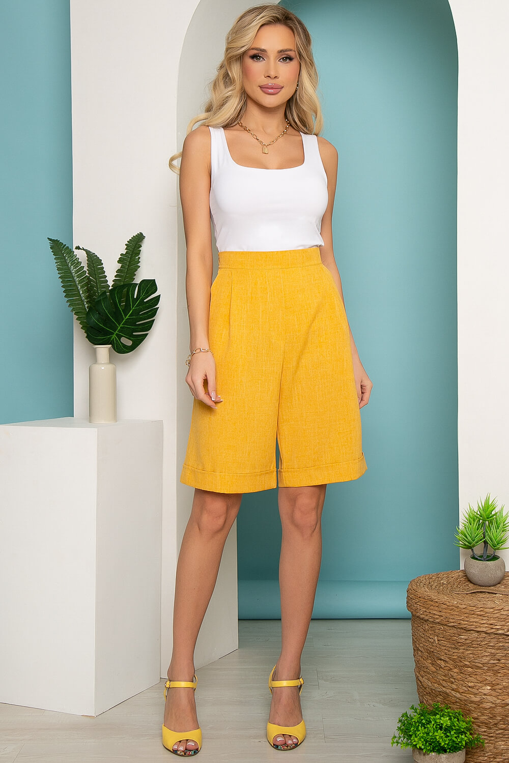 Шорты-бермуды - стильный тренд сезона. Помогут создать интересный деловой образ, если дополнить жакетом или украсят Ваш привычный повседневный. Шорты с высокой посадкой, на притачном поясе. Шорты имеют защипы по переду, карманы, имитацию гульфика, а также отвороты по низу. В боковом шве потайная молния, по спинке на резинке для идеальной посадки.