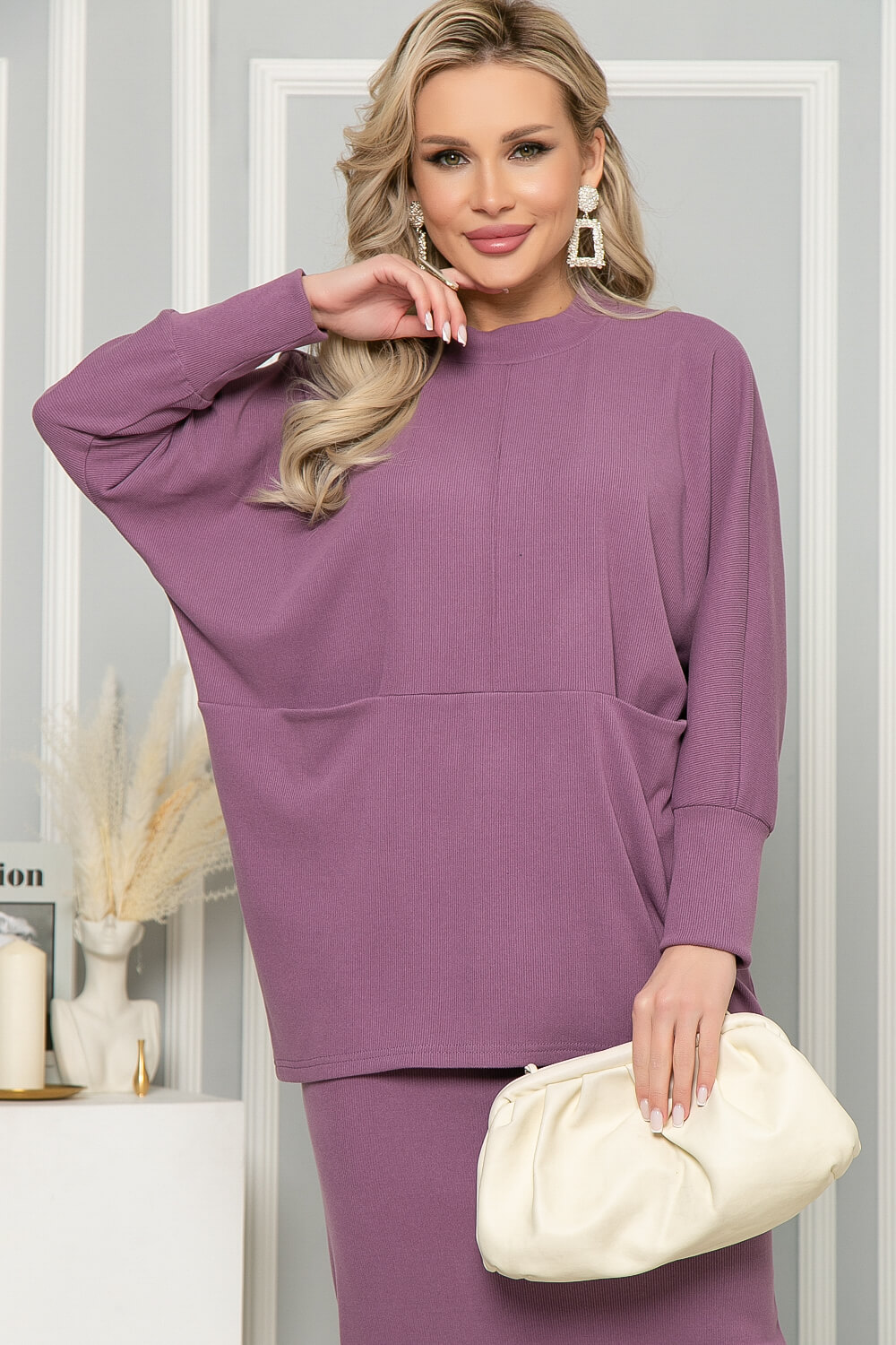 Костюм-двойка, состоящий из юбки на резинке и джемпера свободного кроя. Очень удобный комплект для создания стильного повседневного образа. Удлиненный джемпер прямого кроя имеет длинный рукав. Пройма рукава - "Летучая мышь". Юбка прямого кроя, по талии на комфортной резинке.
