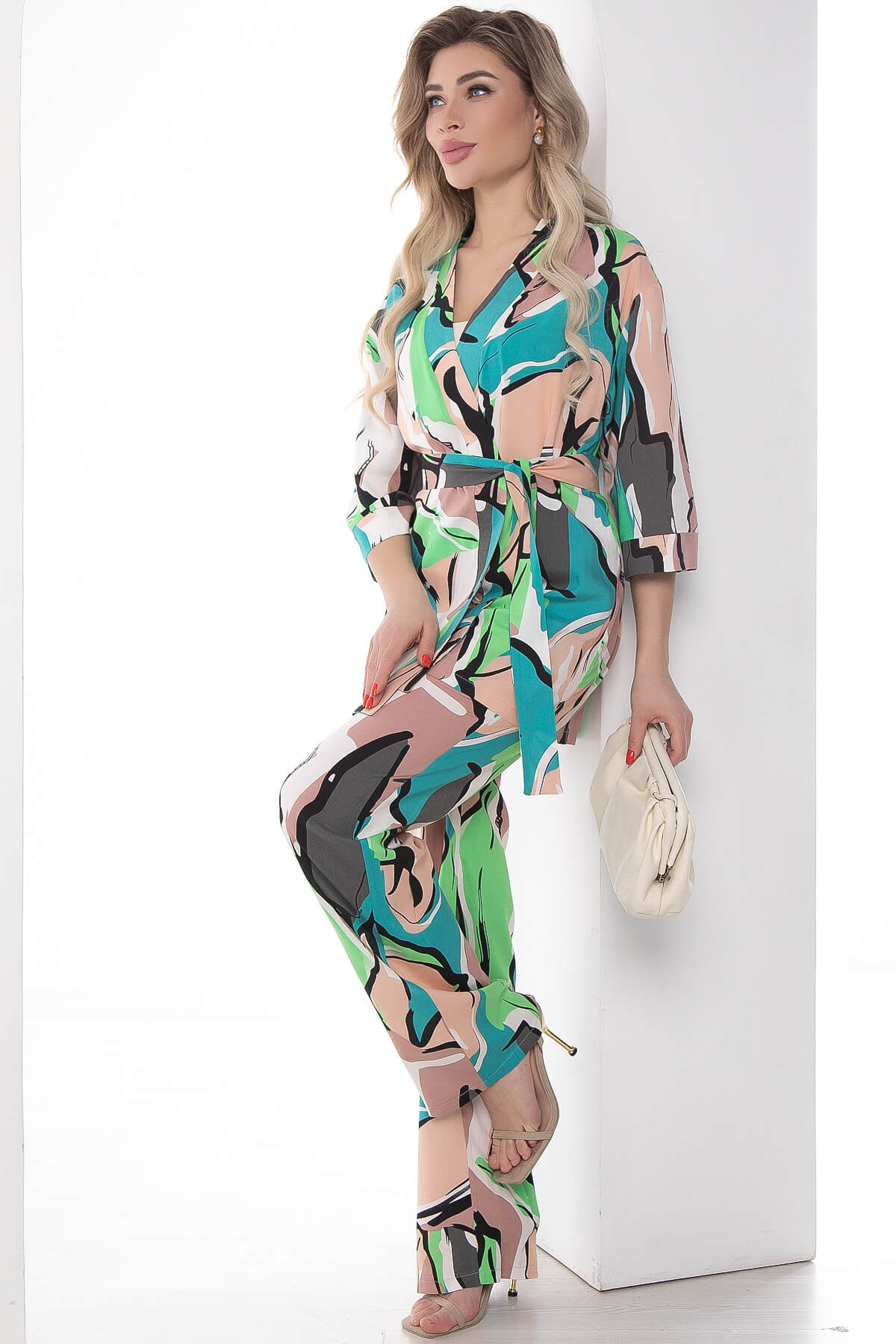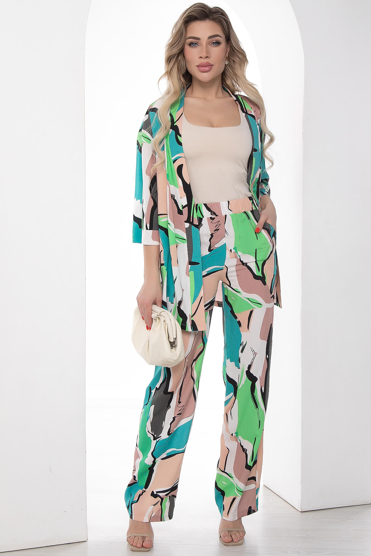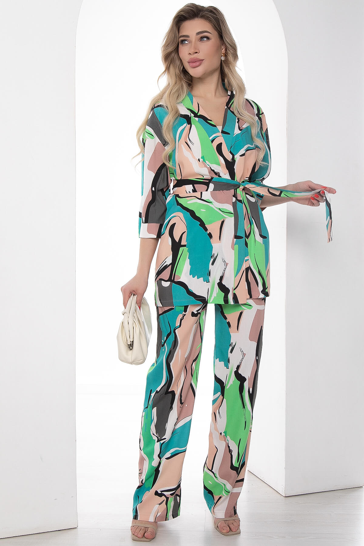 Костюм из лёгкой ткани идеально подойдёт для летнего расслабленного образа. Свободный крой не сковывает движений и дарит комфорт. Рукав укороченный со спущенным плечевым швом.В комплект входит пояс из основной ткани, который позволит подчеркнуть преимущества фигуры.