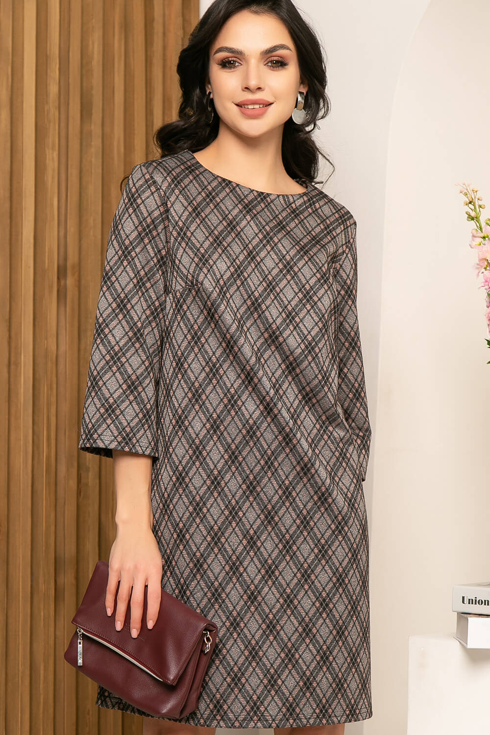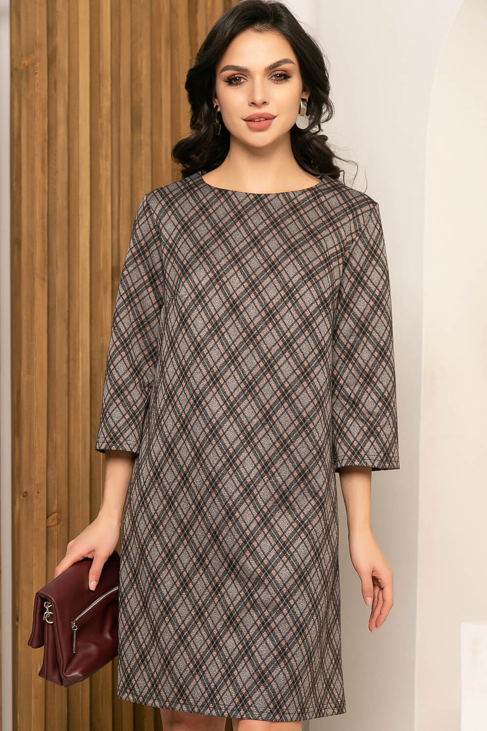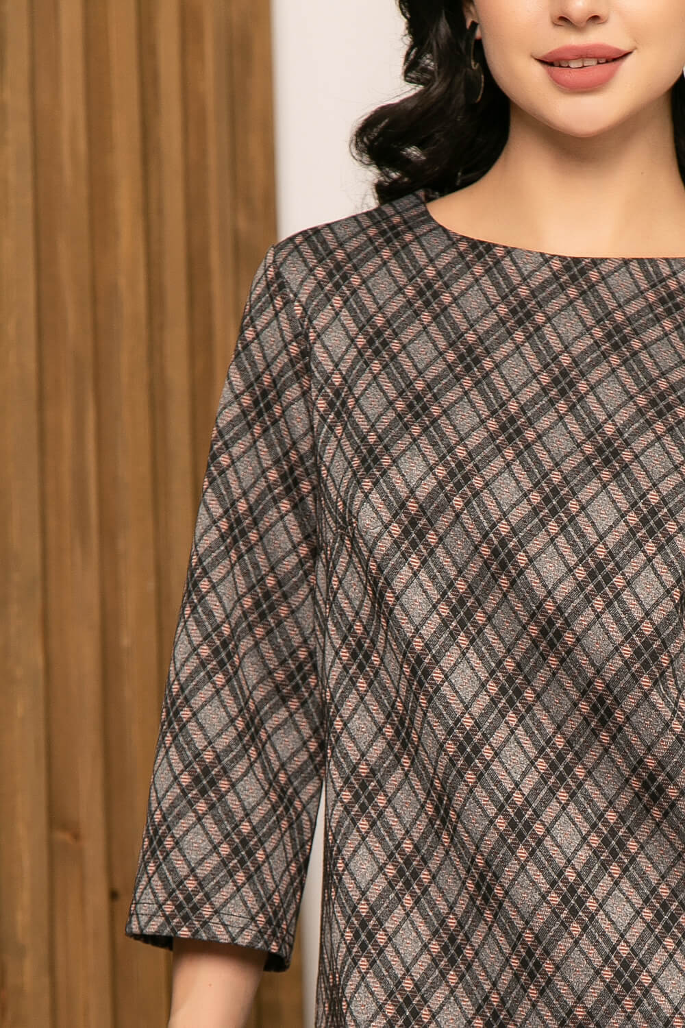 Платье-трапеция с геометрическим принтом из трикотажа - классика повседневного образа. Такой вариант прекрасно подойдёт и для офиса. Рукав втачной, три четверти. Горловина - округлая, обработана обтачкой. Платье без карманов, без подкладки.