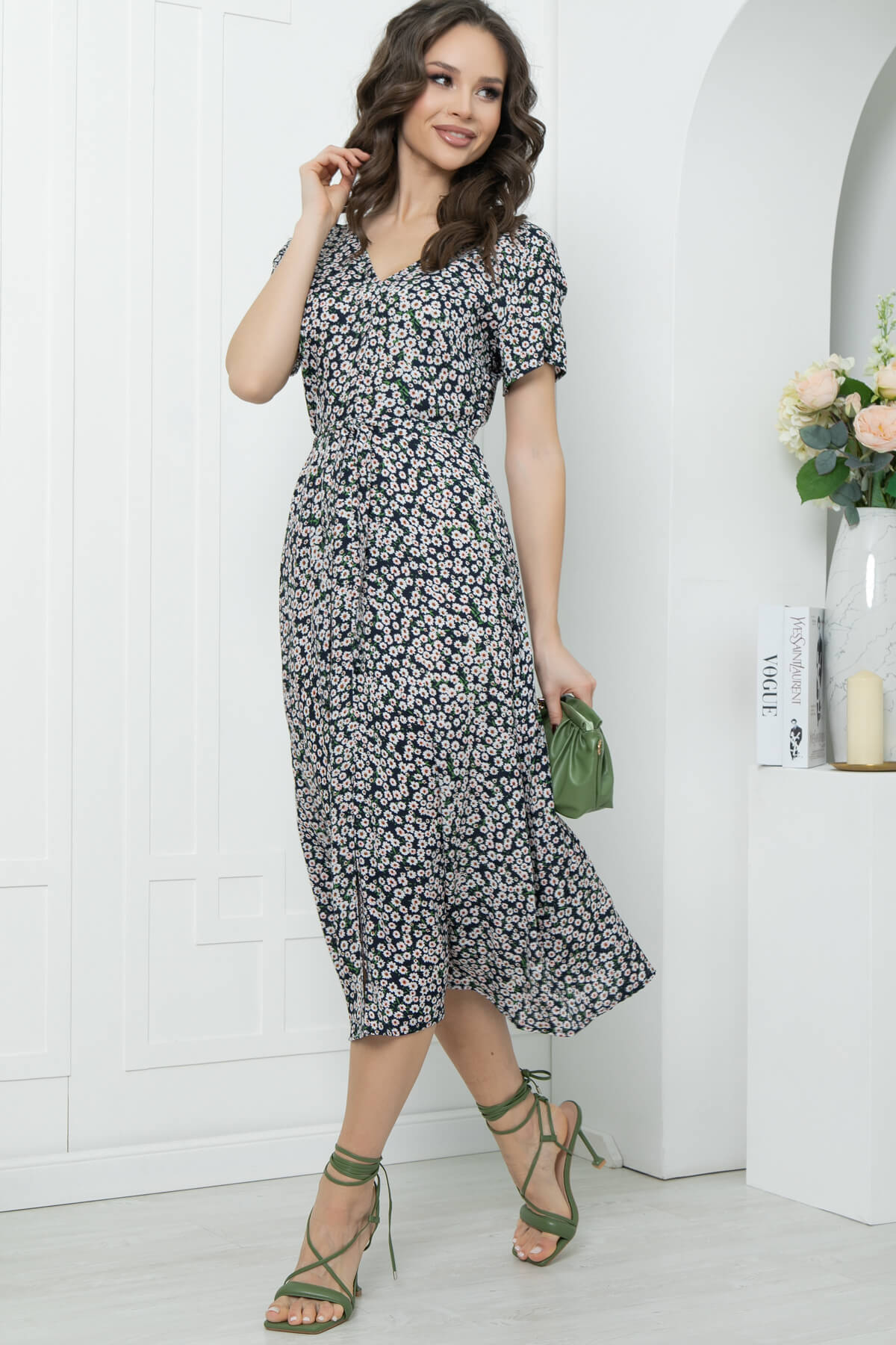 Элегантное платье, которое прекрасно подойдет для прогулки или свидания! Хорошо сочетается с каблучком и с обувью на низком ходу. Хит сезона - платье длины миди из натуральной ткани, с очень популярным сейчас цветочным принтом. Мягкий V-образный вырез красиво подчёркивает шею, тонкий поясок - подчеркнет талию. Небольшой разрез по переду выразительно подчеркнет и удлинит Ваши ножки! В боковом шве потайная молния.