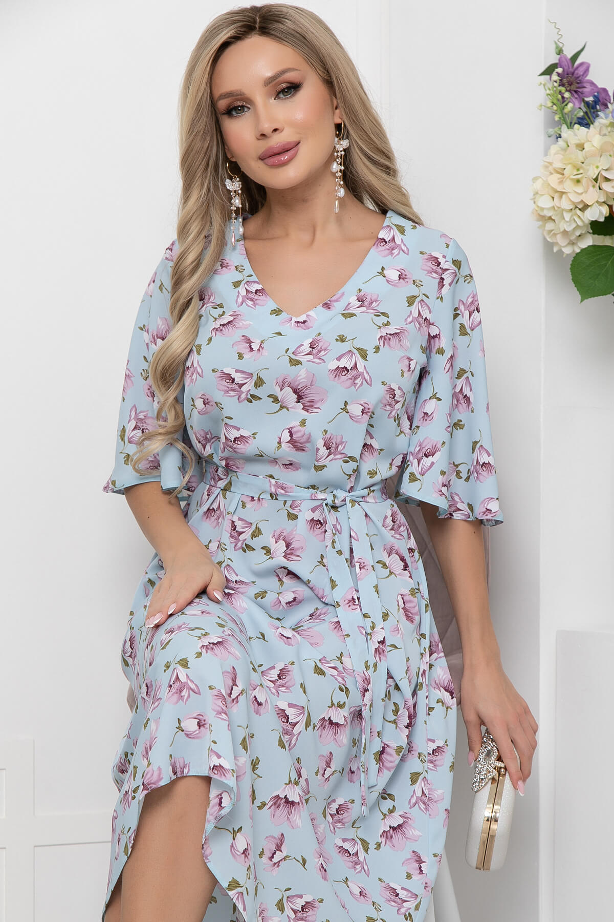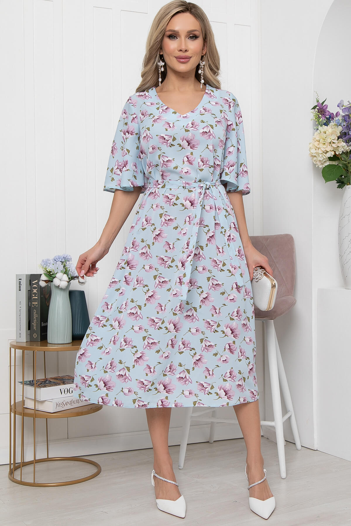 Невероятно нежное платье из легкой ткани отлично подойдет на каждый день. За счет своего принта, изделие отлично смотрится даже без украшений. Изюминку образу дополняют рукава по форме "волан". Преимущества фигуры подчеркнет пояс из основной ткани, который идет в комплекте.