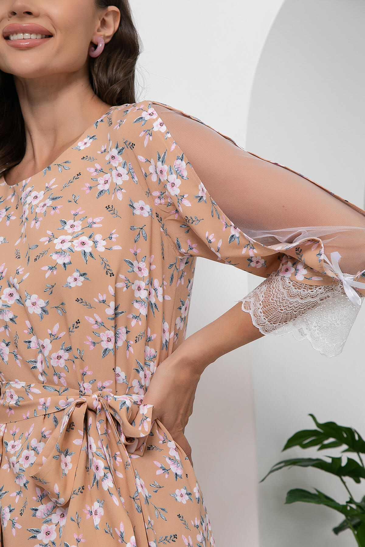 Платье, наполненное всеми атрибутами женственности. Лёгкое, струящееся платье подойдёт для любого типа фигуры за счет свободного кроя. При помощи пояса, входящего в комплект, можно подчеркнуть линию талии. Вырез горловины - округлый. Рукав втачной, три четверти, украшен сеткой с кружевом по нижнему краю и атласными лентами.