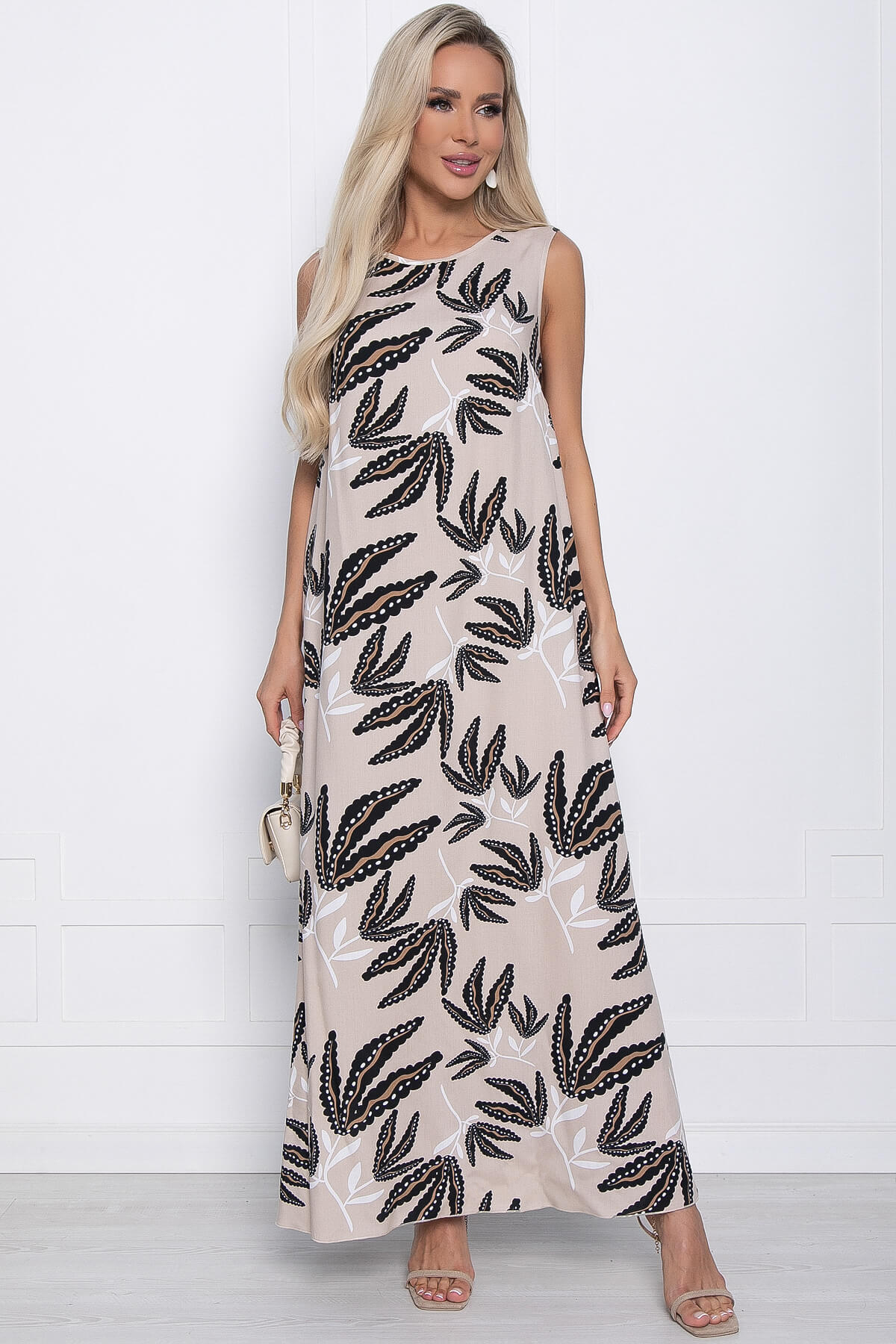 Привлекательное платье в бежевом оттенке с крупным принтом для солнечных летних дней! Можно сочетать с белыми кедами для создания стильного повседневного образа. Для более нарядного образа можно подобрать туфли, сумку и аксессуары. В комплект входит пояс из основной ткани, которым можно подчеркнуть талию.