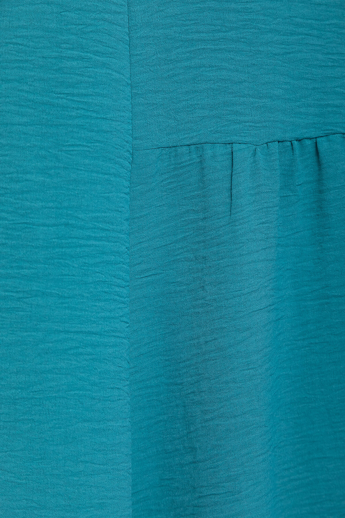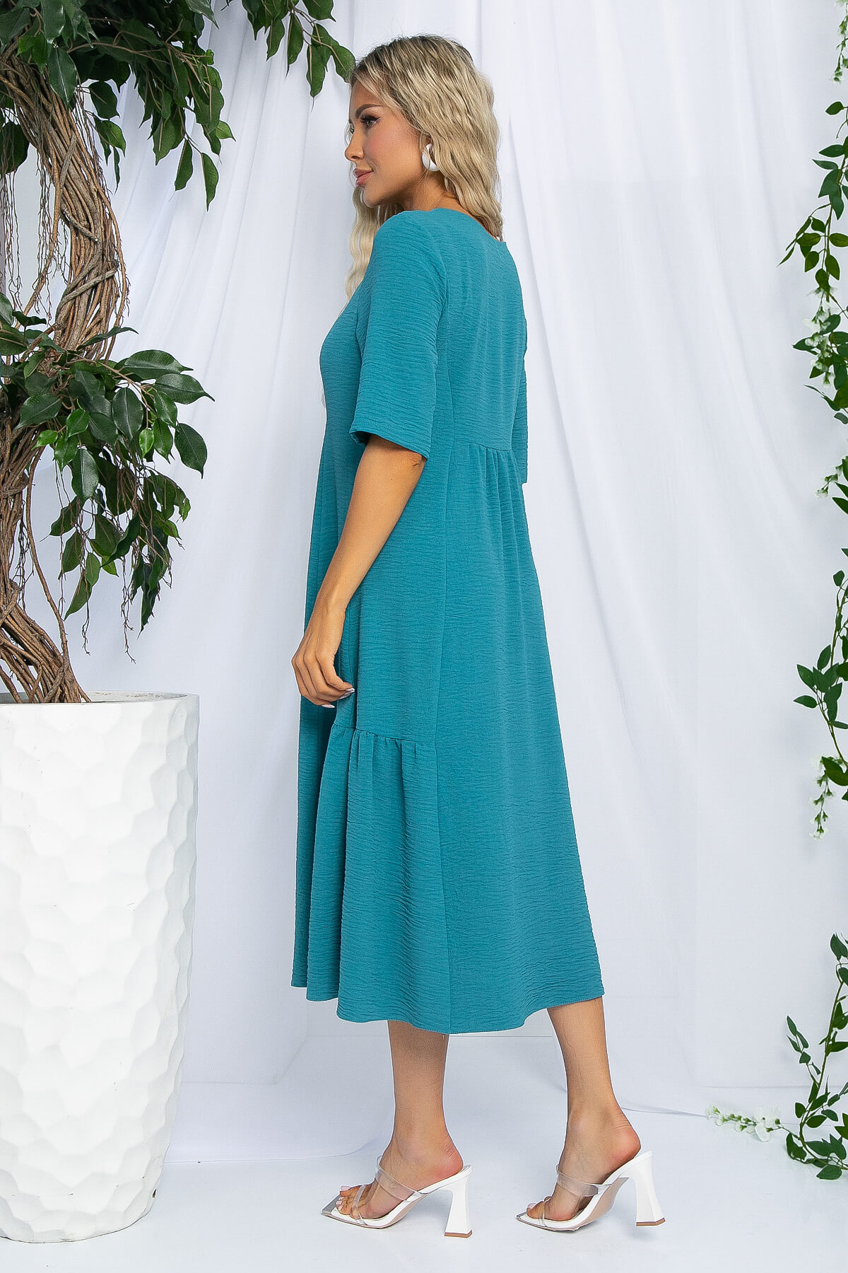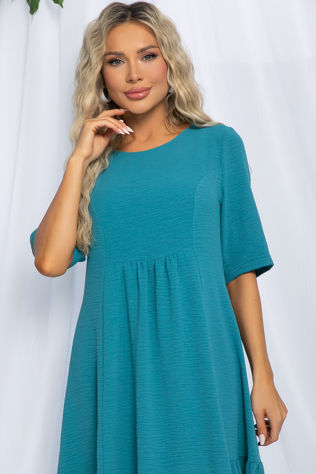 Платье свободного кроя средней длины — это прекрасный выбор для создания стильного и комфортного летнего образа! Его округлая горловина и втачные рукава средней длины придают платью изысканность. Платье расширяется к низу от линии груди, создавая нежный и воздушный силуэт. Декоративные элементы в виде сборок по бокам и чуть ниже линии груди спереди и сзади придают ему неповторимую изюминку. Это платье станет настоящим украшением вашего гардероба!