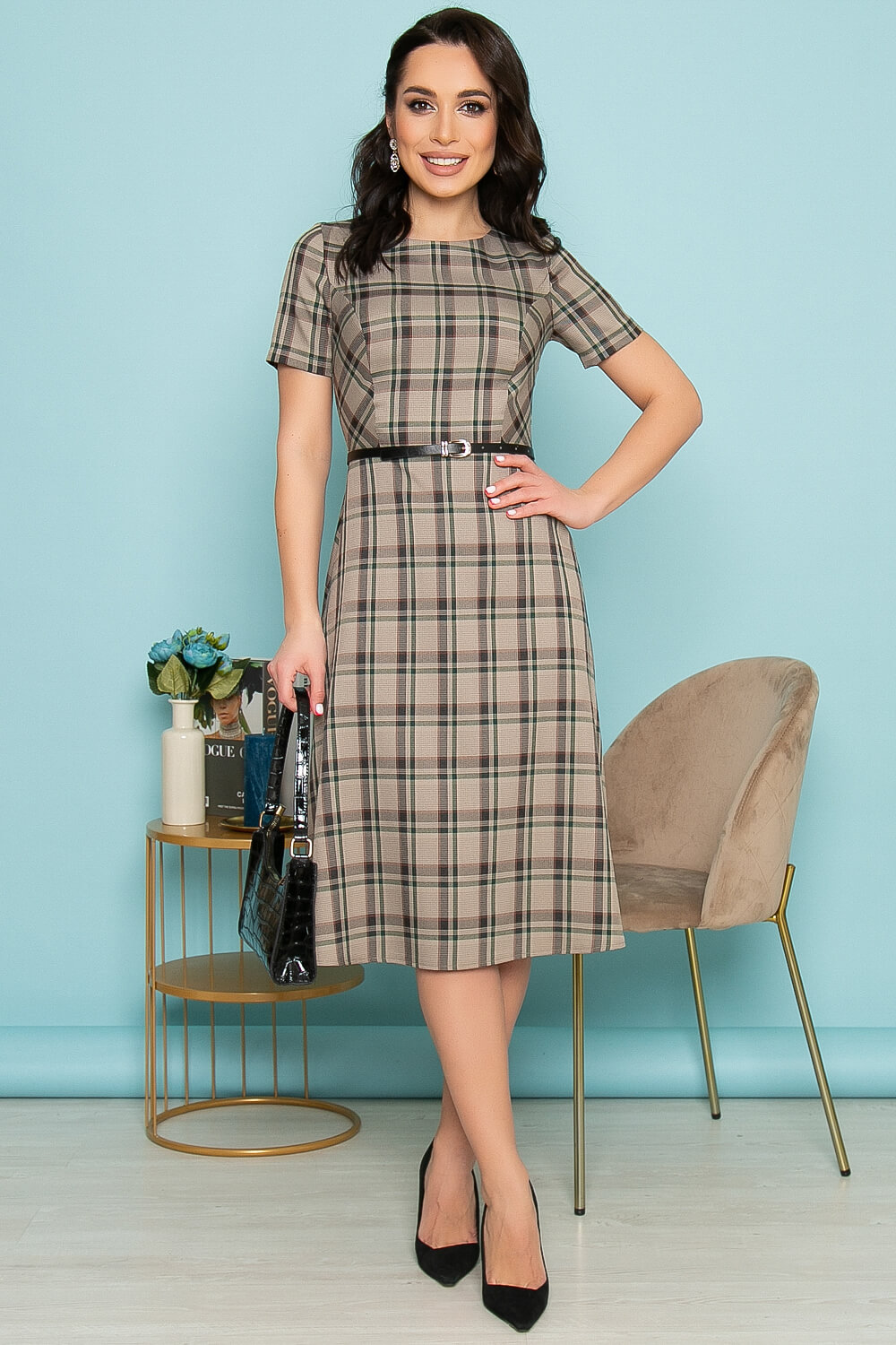 Платье в клетку, говорящее о тонком чувстве вкуса его обладательницы. Элегантный силуэт, качественные материалы, практичность - характеристики идеального платья в английском стиле. Платье приталенного силуэта средней длины. Юбка А-силуэта, втачной короткий рукав. В комплект входит кожаный поясок. Мягкий округлый вырез горловины. По спинке потайная молния.