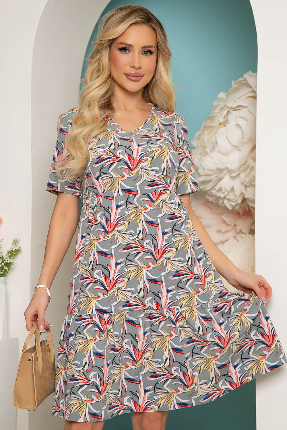 Лёгкое летнее платье с ярким принтом - подходящий вариант для повседневных образов. Можно сочетать с туфлями-лодочками или кедами. Платье свободного кроя, рукав втачной, короткий. Низ юбки украшает широкий волан. V-образный вырез горловины. Платье без замков, без подкладки.