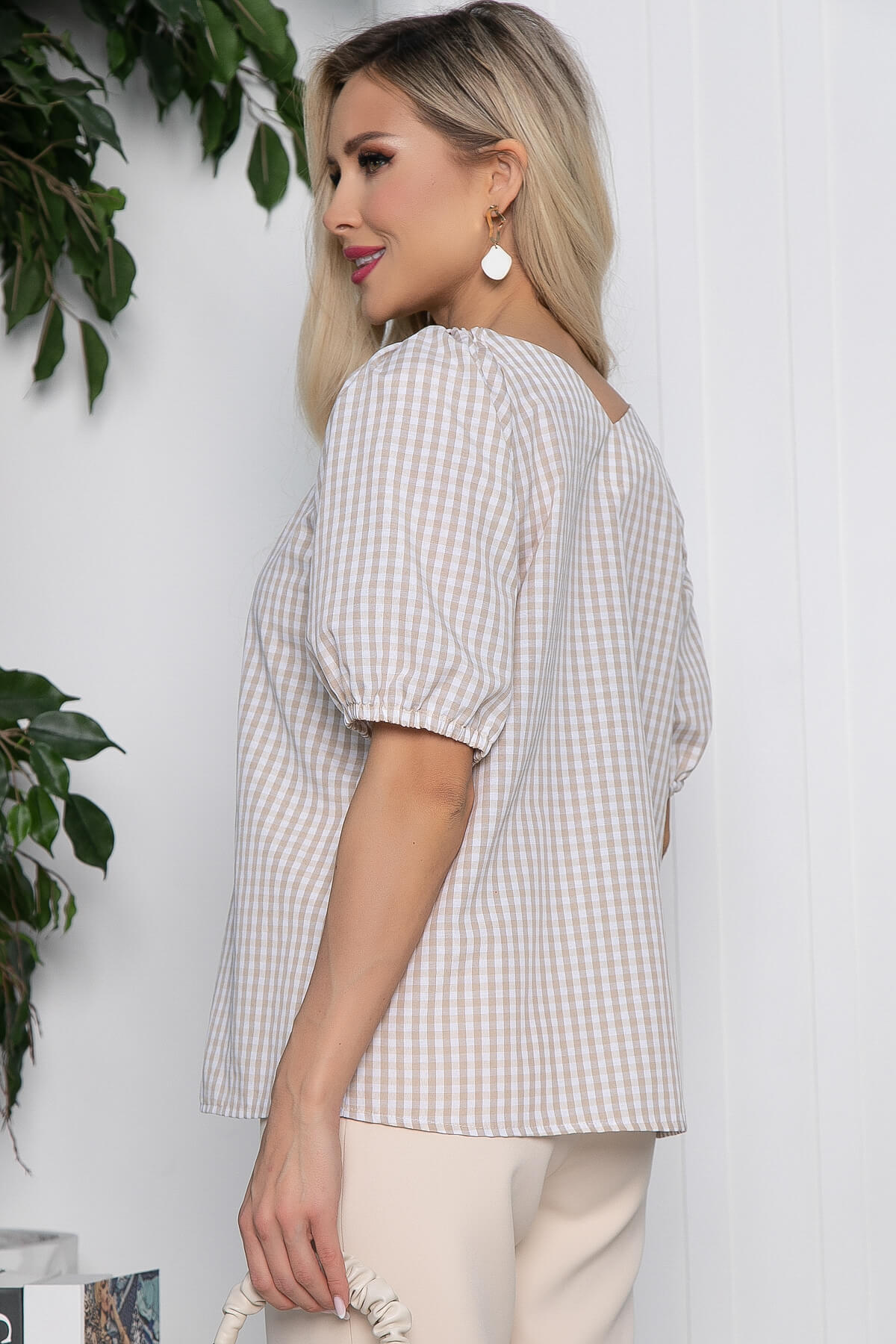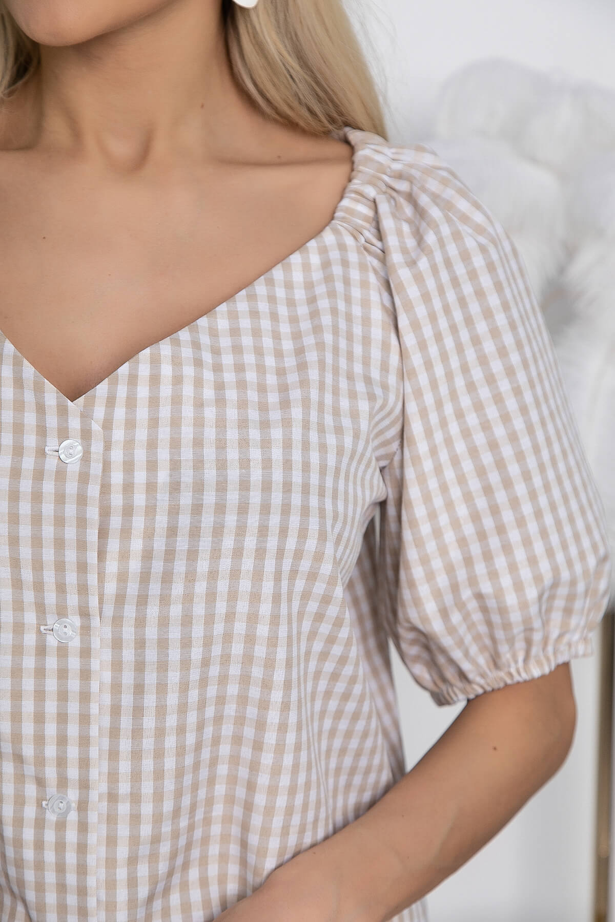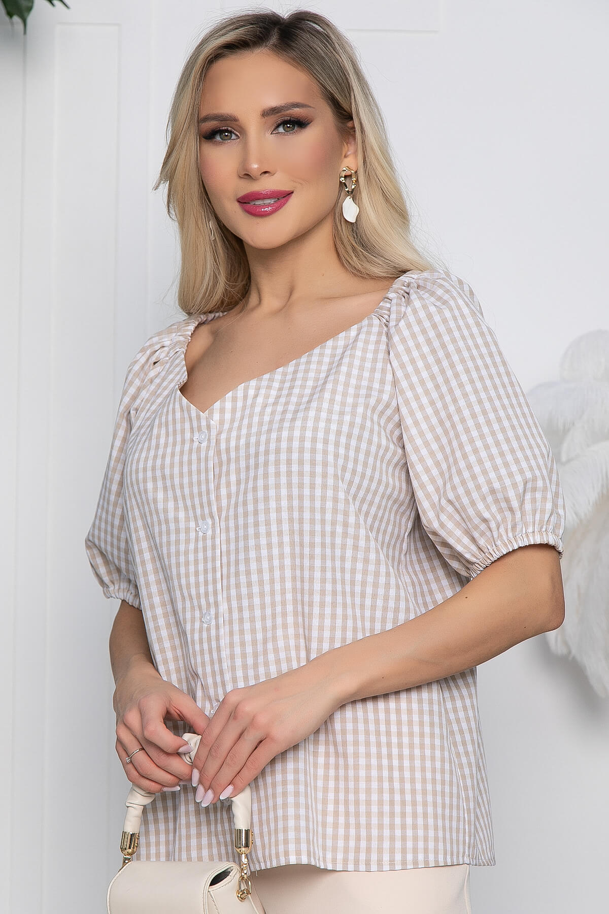Легкая и воздушная блуза в клетку свободного кроя. Комфортная эластичная резинка на плечах позволяет сделать блузу еще более женственной. Рукав - реглан укорочен и собран на резинку. Такая модель женской блузы отлично будет сочетаться как с джинсами, так и со светлыми брюками любого кроя.