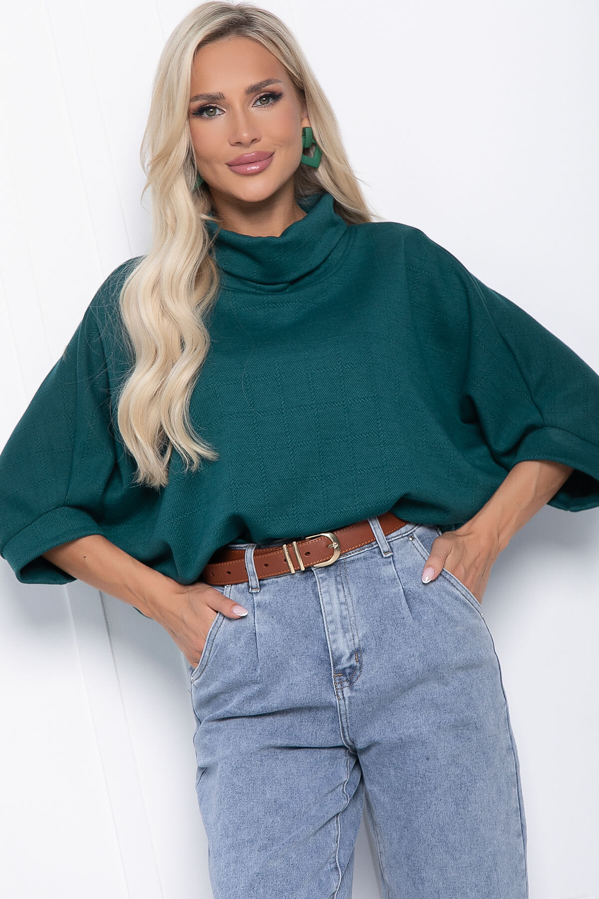 Самые непредсказуемые ансамбли и живописные образы позволяет создать джемпер, вписывающийся в самые разнообразные стили. Удобное, практичное, функциональное изделие позволит сочетать его с разнообразным низом, а мягкий трикотаж подарит комфорт в прохладную погоду. Джемпер имеет акцентную горловину, а рукава скроены по типу «Летучая мышь». Свободный крой позволит скрыть недостатки фигуры.