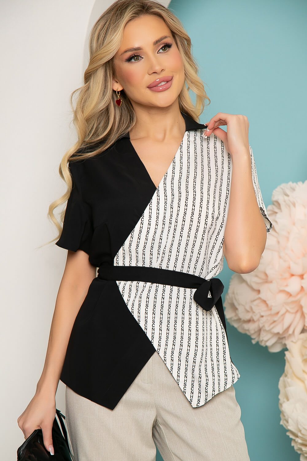 Блуза оригинального кроя внесёт деликатное разнообразие в Ваш деловой гардероб. Блуза сшита из контрастных половинок, что добавляет образу изысканности. Отдельного внимания заслуживает крой ворота. Запах создаёт V-образный вырез, верх которого украшает отложной воротничок. Такая деталь делает образ изысканным. Блузу можно завязывать по боку, обхватывая талию контрастным поясом, или по спинке, оставляя силуэт более свободным.