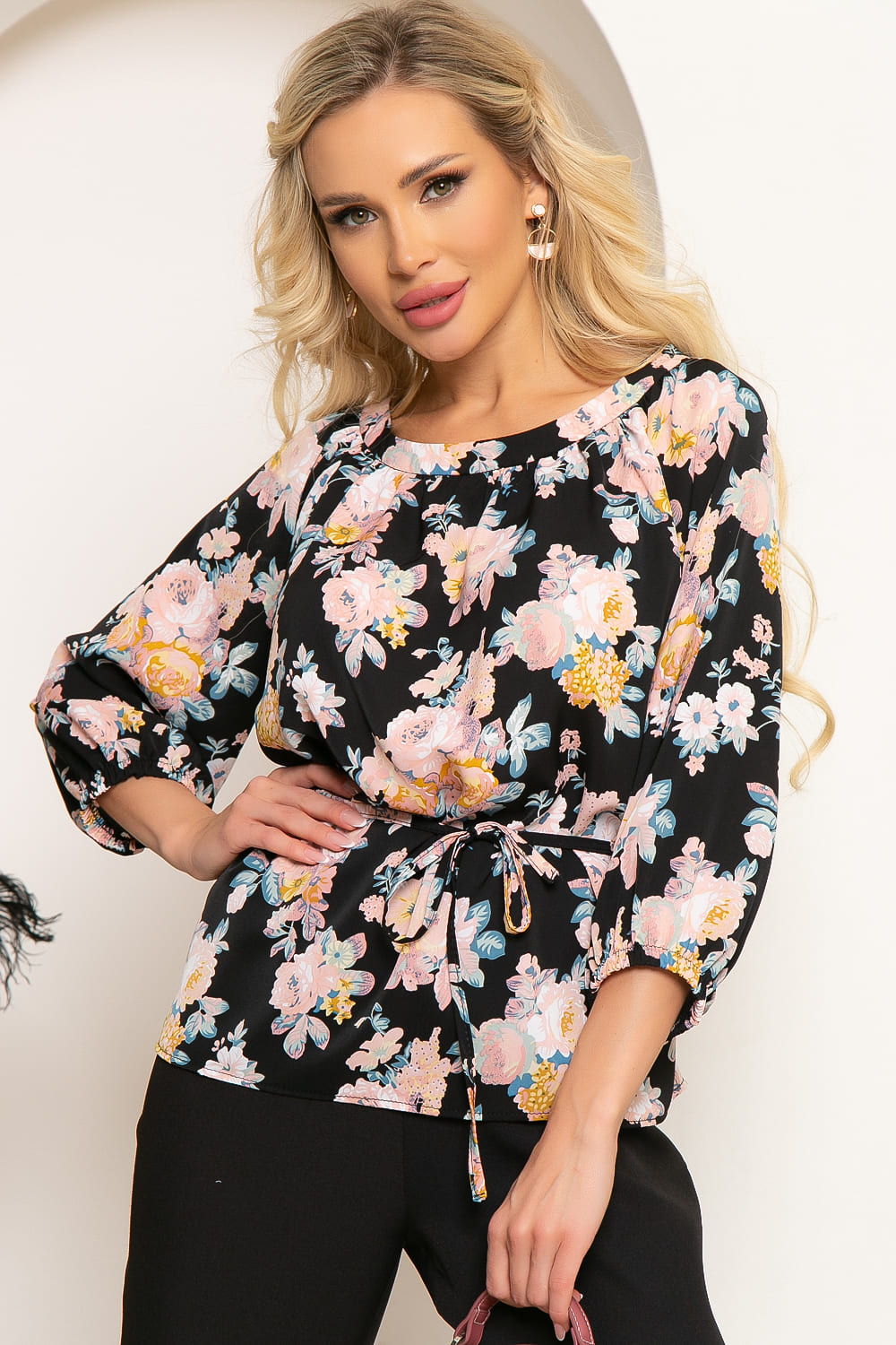 Блуза с цветочным принтом смотрится естественно и свежо на каждой женщине, независимо от возраста и типа фигуры. Свободный крой обеспечит комфортную посадку и не будет сковывать движений. Акцентный вырез горловины оформлен притачной планкой. Рукав-реглан, свободный, три четверти, на резинке. В комплекте пояс из основной ткани, который позволит подчеркнуть линию талии.