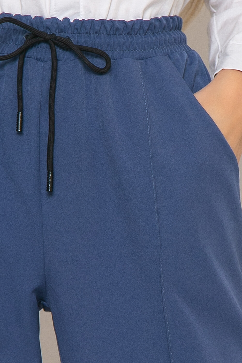 Базовые брюки с отстроченными стрелками в красивом оттенке "Грозовое небо" прекрасно подойдут для создания официально-делового образа. Пояс на резинке обеспечит комфортную посадку на талии, при помощи кулиски можно регулировать ширину пояса. Оригинальности добавляет ассиметричный низ брючин - спереди кроче, сзади длиннее. Хорошо будут смотреться в сочетании с блузами, рубашками и джемперами нейтральных оттенков.