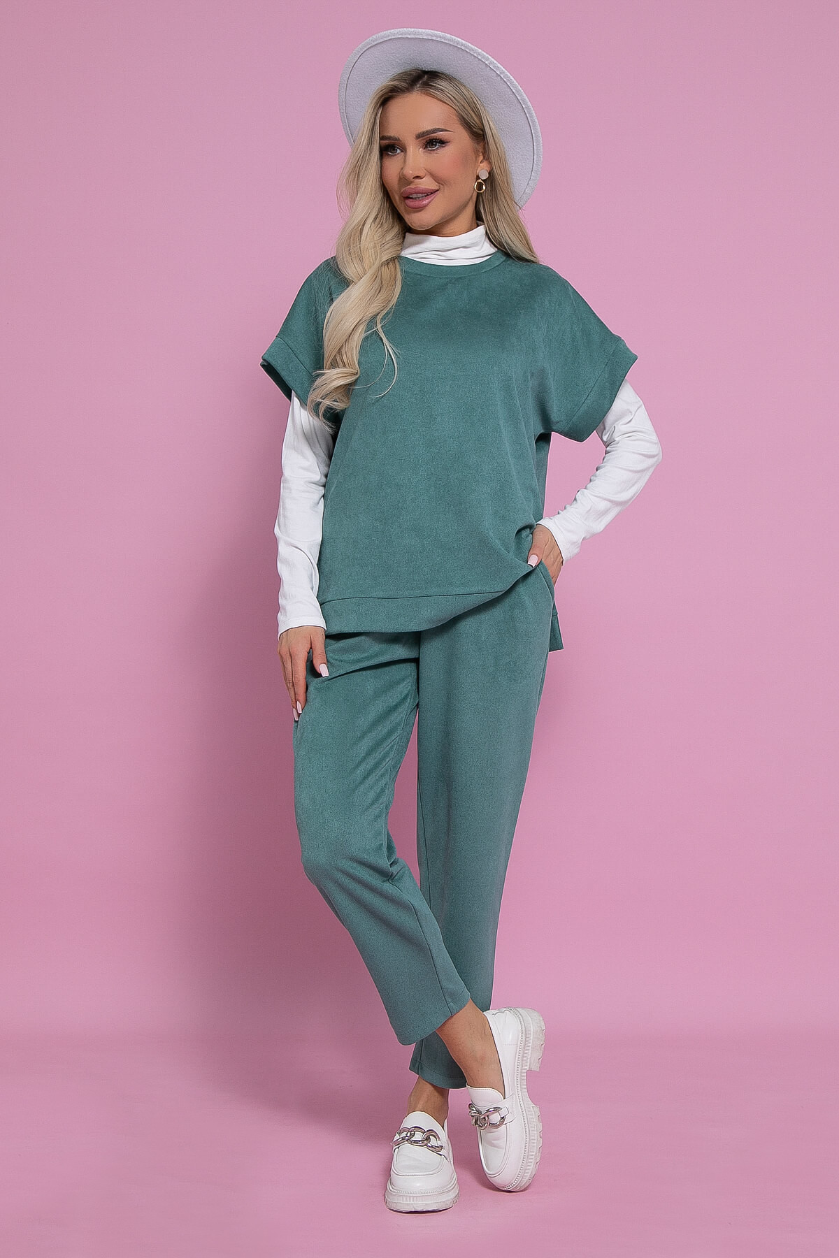 Брючный женский комплект — это прекрасный выбор для тех, кто ценит комфорт и стиль в одежде. Он отлично подходит как для повседневной носки, а также станет отличным дополнением к вашему домашнему гардеробу. Костюм состоит из блузы прямого силуэта и укороченных брюк. Рукав блузы цельнокроеный, с манжетой. Верх заканчивается на поясе с разрезами по бокам. Брюки заужены к низу, с функциональными карманами и разрезами по бокам снизу. Каждый элемент костюма можно носить отдельно, комбинируя с другими вещами из вашего гардероба. Он идеально смотрится как с туфлями, так и с кроссовками.