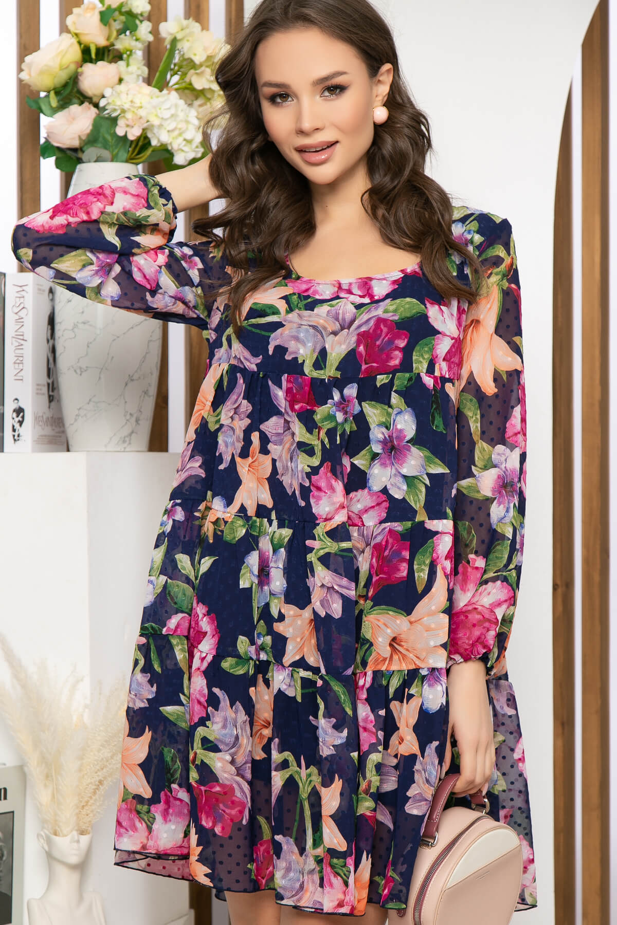 Платье из шифона свободного кроя, на подкладке. Рукав втачной, длинный, низ на резинке. Юбка состоит из ниспадающих воланов, талия завышена.