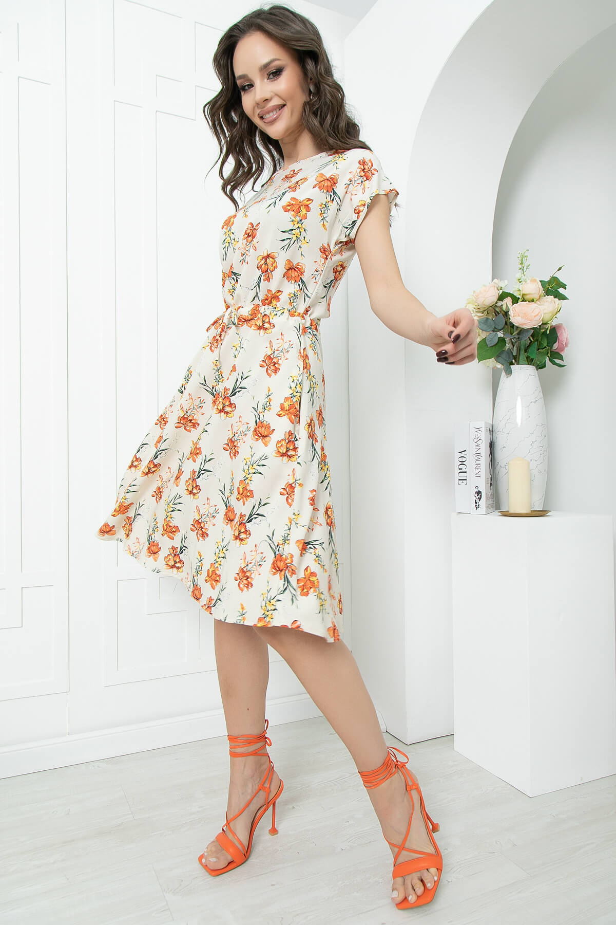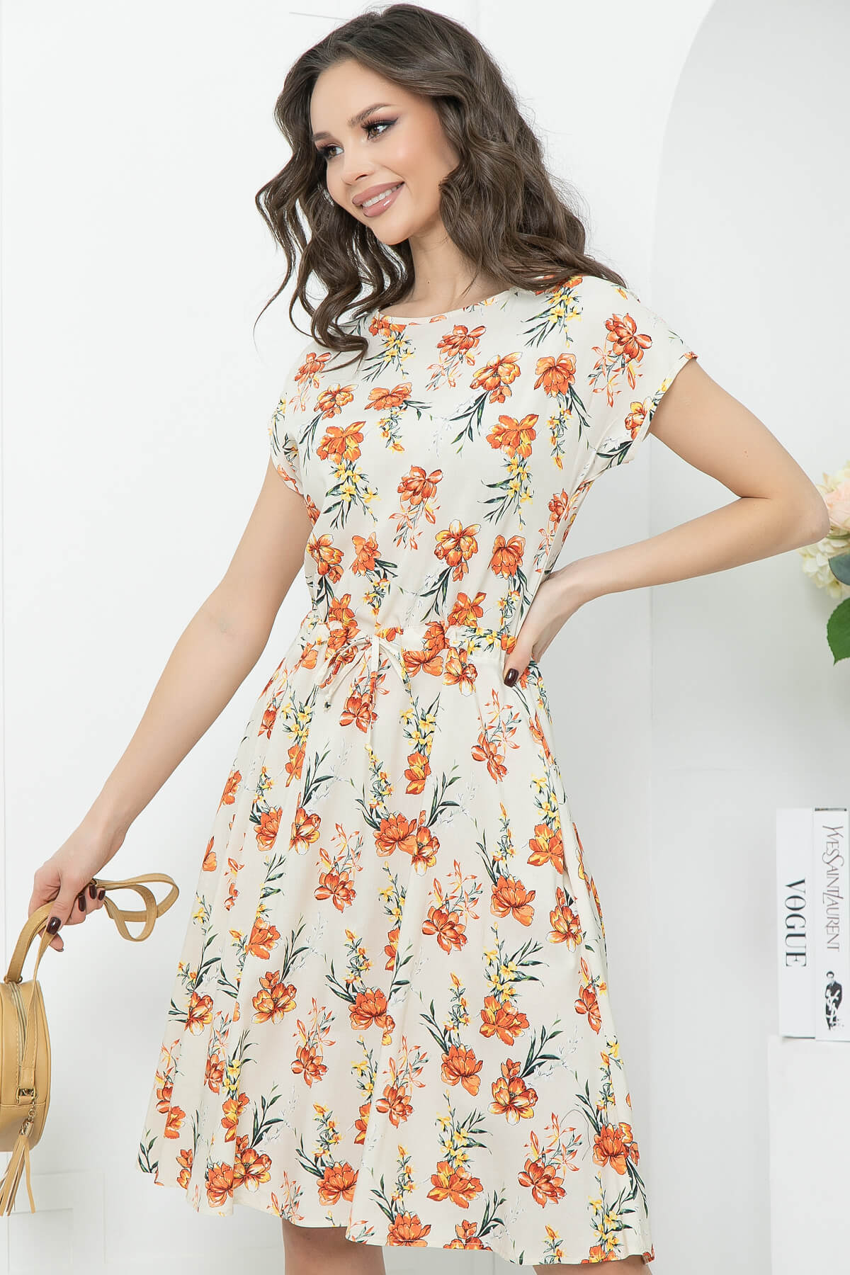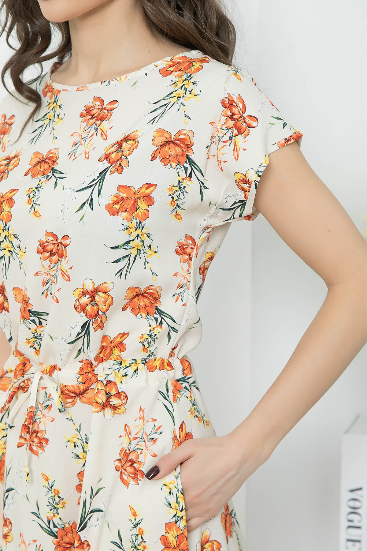 Повседневное летящее платье с цветами подарит хорошее настроение на весь день! Талия на кулиске позволяет добиться идеальной посадки по фигуре. Рукав укороченный, втачной. В боковых швах есть карманы. Платье без замков, без подкладки.