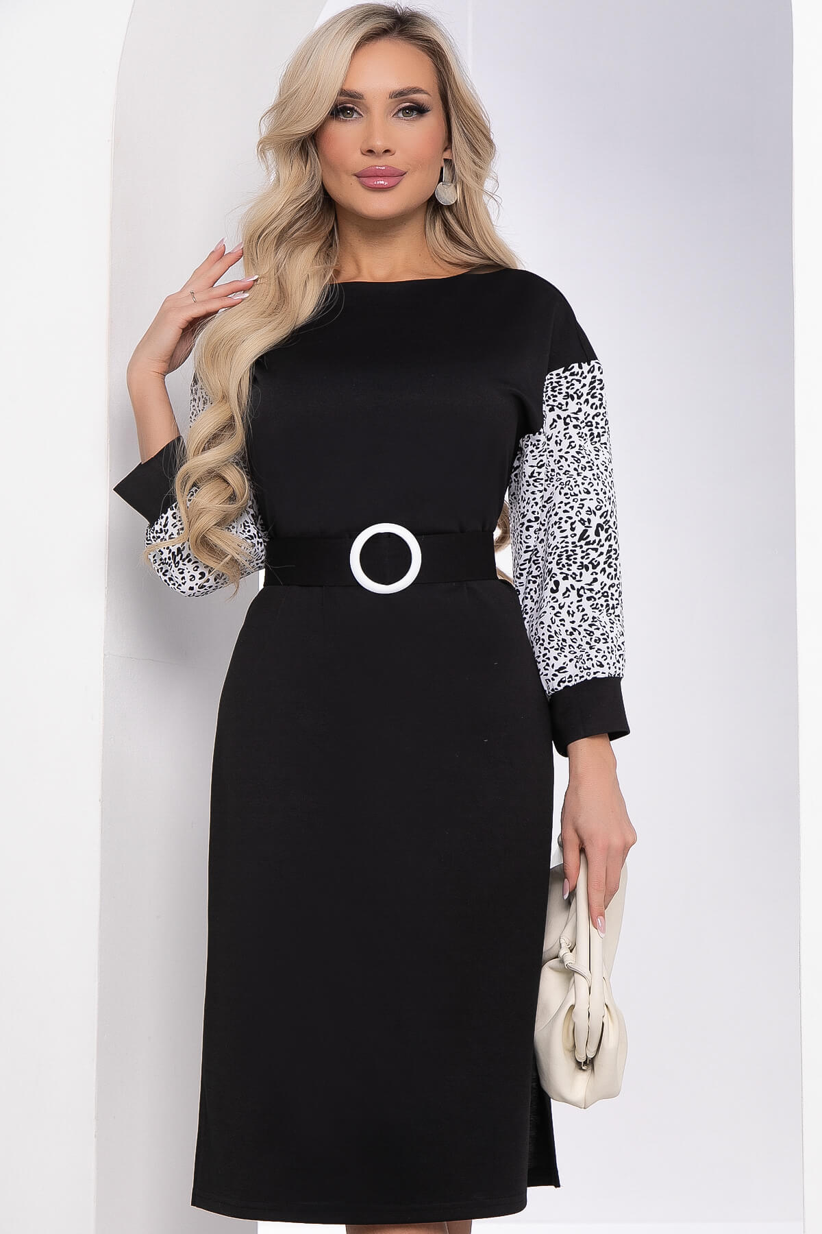 Стильное платье с черно-белым принтом на рукавах отлично подойдет для офиса и деловых встреч. Платье прямого кроя является самой удобной моделью, скрывает недостатки в фигуре и не ограничивает в движениях. Рукав три четверти со спущенным плечевым швом, по низу манжет. В комплект входит пояс из основной ткани с белой пряжкой.