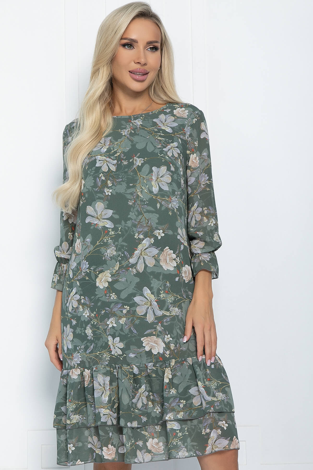 Платье прямого кроя из шифона - изящное и практичное решение для любого случая. Оно отлично подходит для официальных мероприятий, вечерних прогулок или романтических свиданий. Низ платья украшен двойным воланом, который придает изысканность образу. Горловина платья округлая, с окантовкой. Рукава втачные 3/4, на резинке. Завязывается на завязках на спинке.