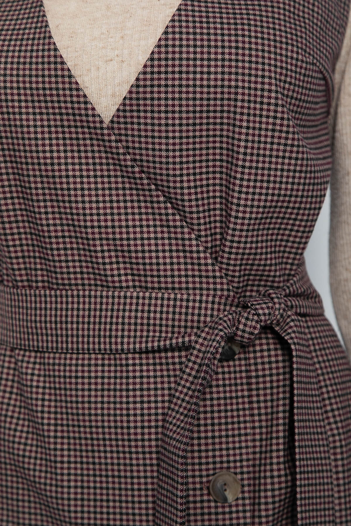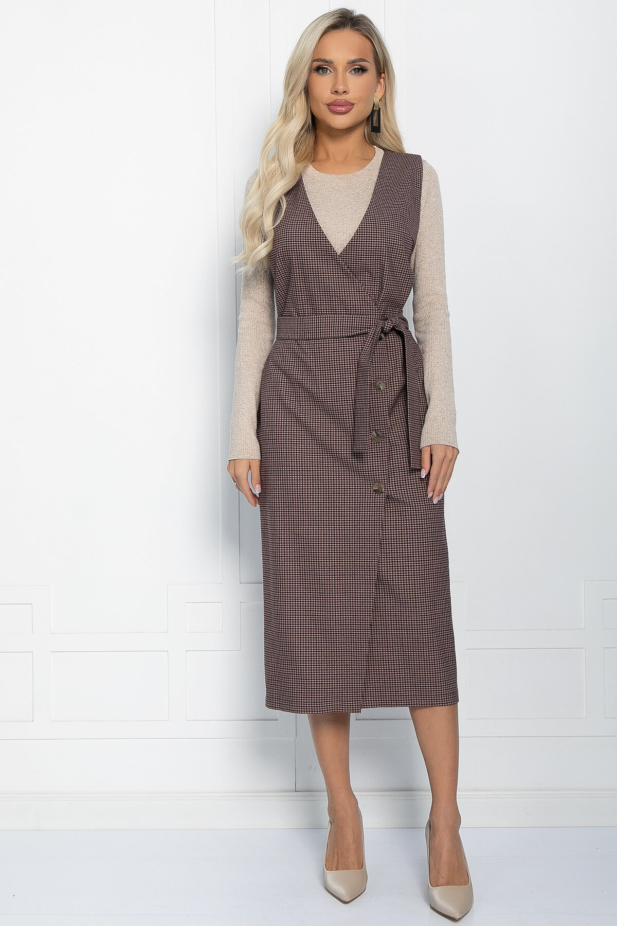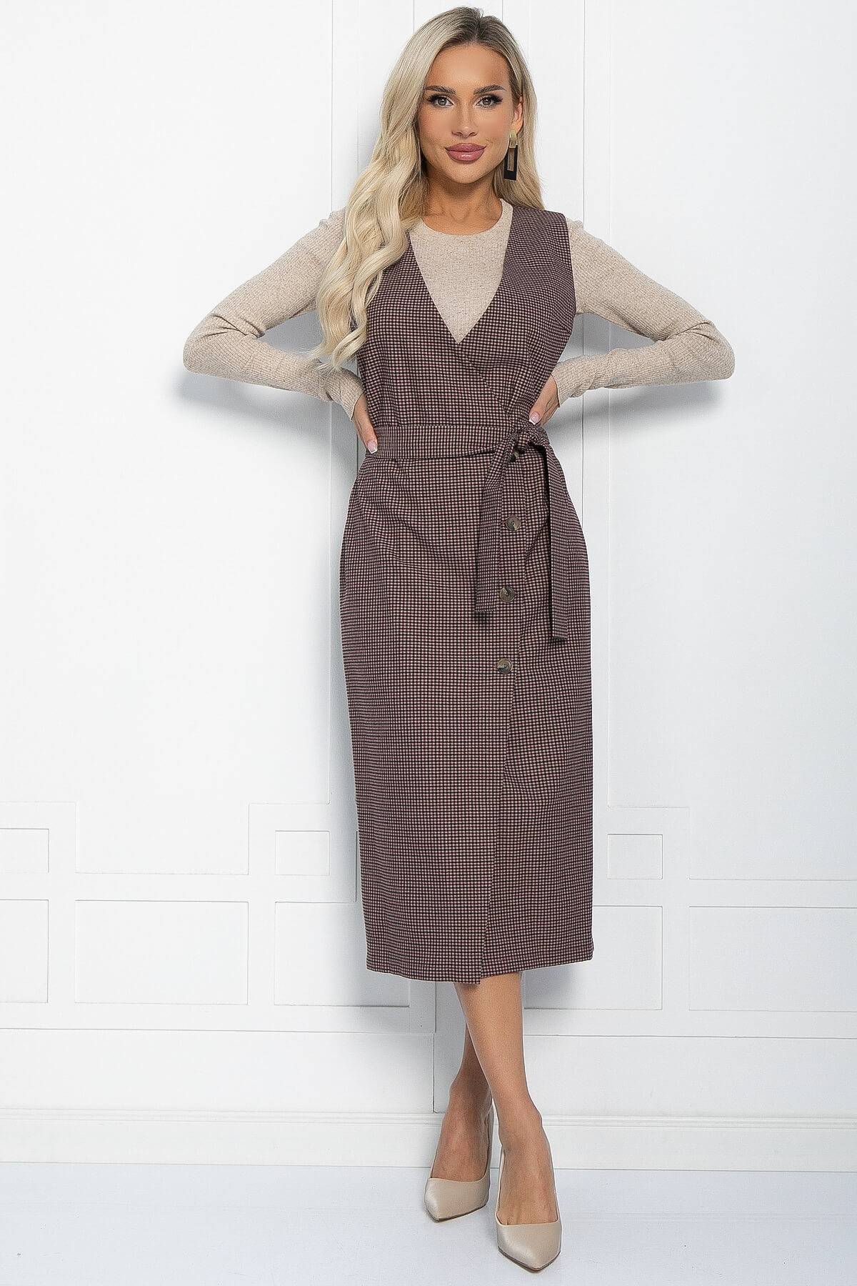Сарафан в деловом стиле, создающий элегантный образ и подчеркивающий грацию фигуры. Этот сарафан, скроенный на запах, имеет пояс из основной ткани и выполнен из костюмной ткани без подклада, что не только придает ему легкость, но и обеспечивает свободу движений. Он универсален и может носиться как самостоятельный наряд, так и в сочетании с футболками или рубашками. Прекрасно сочетается с различной обувью, начиная от туфель на каблуке до лоферов и сапог. Этот сарафан также отлично подходит для экспериментов с аксессуарами, что позволяет создавать разнообразные образы на каждый день.