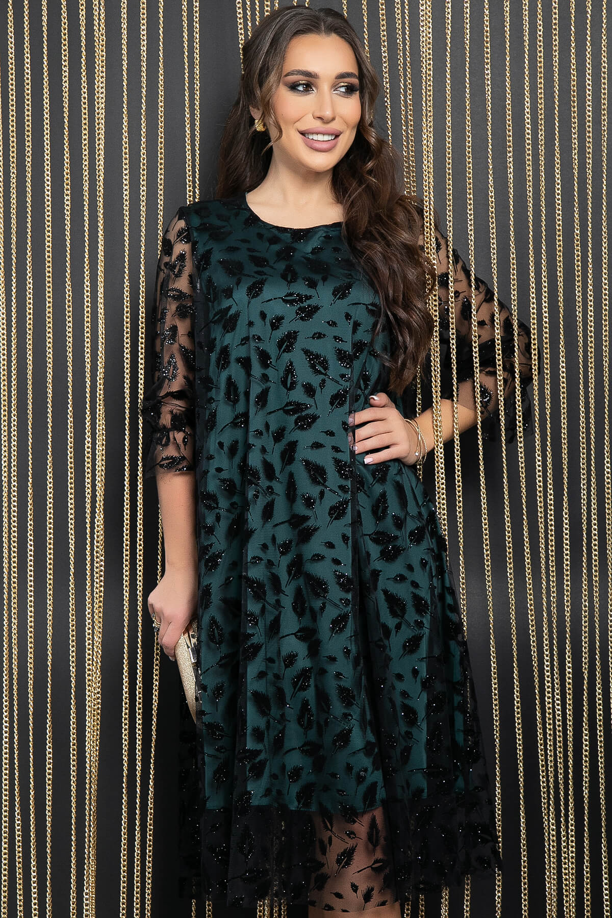 Легкое и воздушное платье создано для того, чтобы покорять сердца. Невероятное, мерцающее платье выполнено из переливающихся тканей двух цветов. Свободный крой скрывает недостатки фигуры. Рукав длинный, втачной, выполнен из сетки с принтом, по низу украшен воланом. Нарядное платье хорошо стилизуется с классическими туфлями.