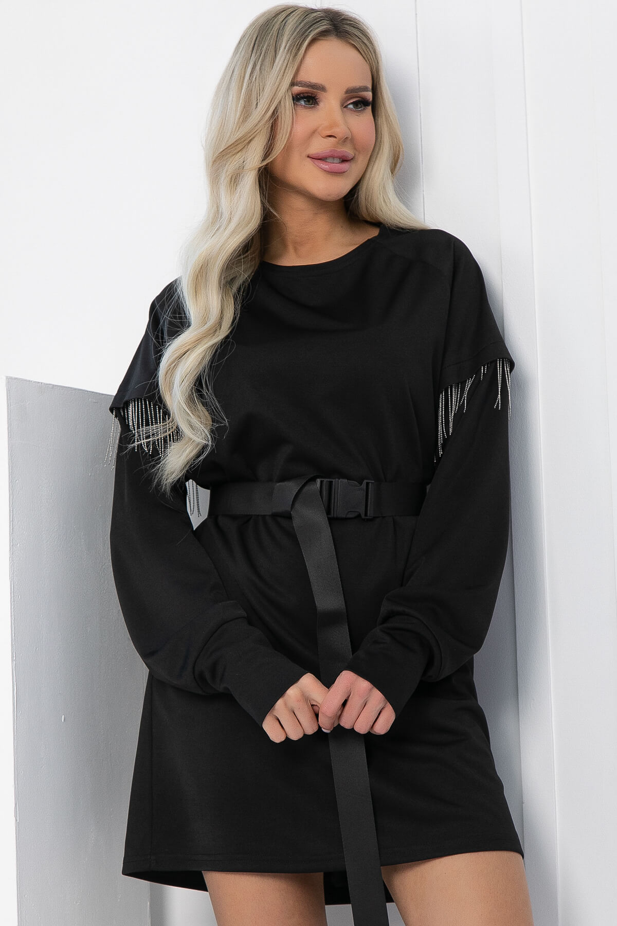 Трикотажное платье свободного кроя в чёрном оттенке — это отличный выбор для создания стильного и комфортного образа! Его отличительной чертой является эффектная металлическая бахрома, которая придаёт ему оригинальности. Модель оснащена удобными боковыми карманами. Элегантные рукава с высокой манжетой не только добавляют образу изысканности, но и защищают от холода.