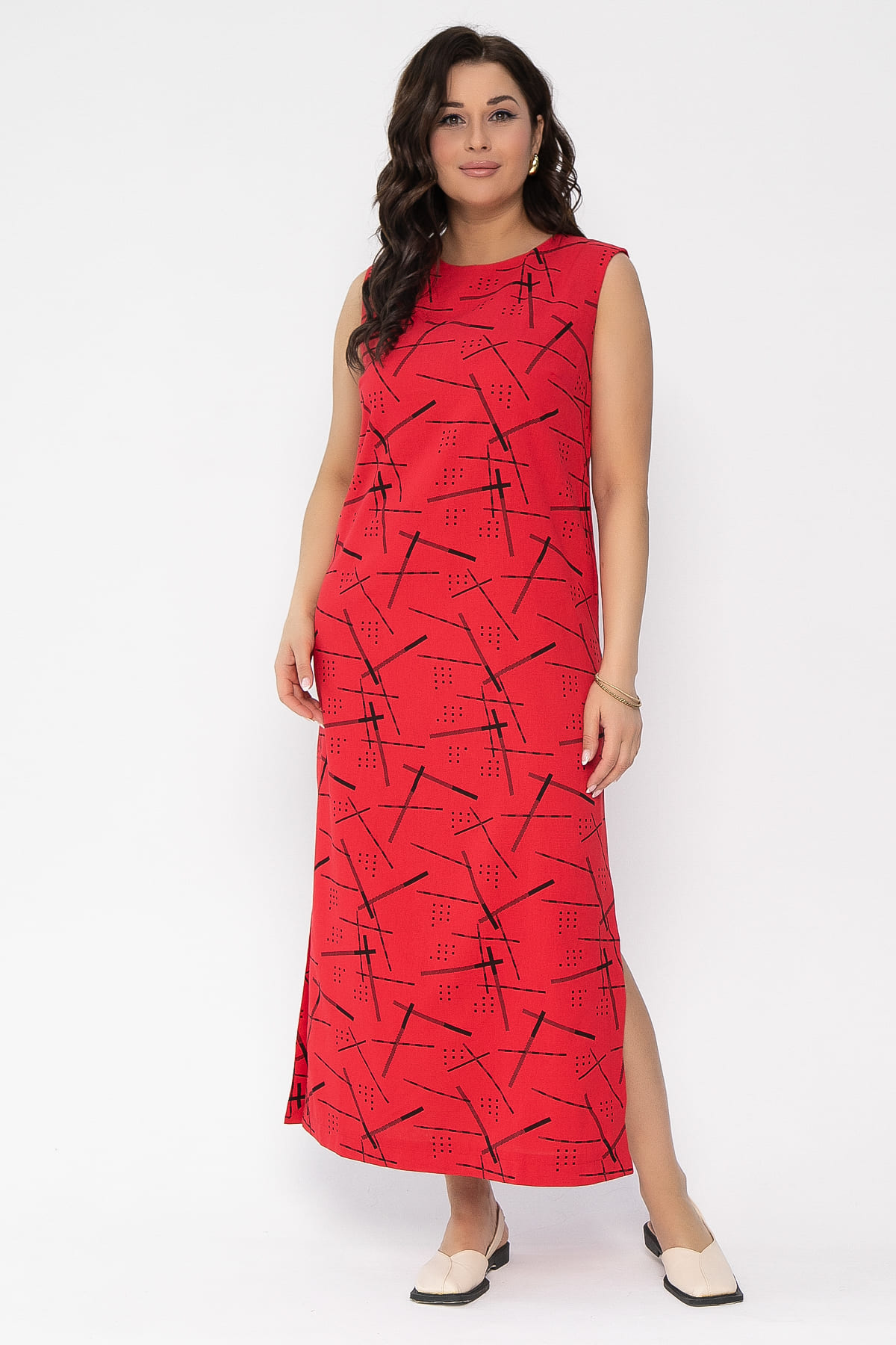 Платье полуприлегающего силуэта без рукавов — это превосходный выбор для тех, кто ценит стиль и элегантность. Потайная молния на спинке обеспечивает удобство в надевании, а горловина и пройма обработаны обтачкой, что придает платью аккуратный и завершенный вид. Разрезы по бокам добавляют нотку изящества и свободу движений.
