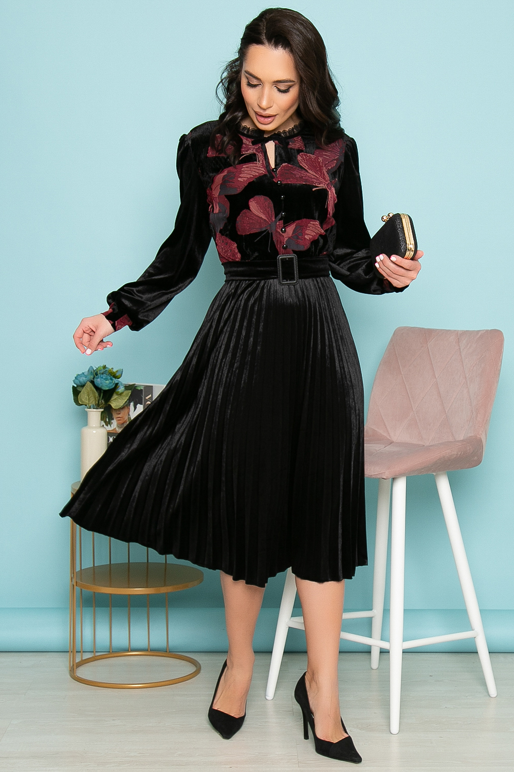 Платье с плиссированной юбкой из бархата в чёрном оттенке. Талья отрезная, рукав длинный на манжете. Красивый воротничок оформлен кружевной стойкой и оформлен бархатной лентой, которая оформляет бантик на вырезе. Передняя часть верха скроена из комбинированного материала с цветочным принтом, украшена пуговками. В комплекте бархатный пояс с пряжкой, подчёркивающий талию.