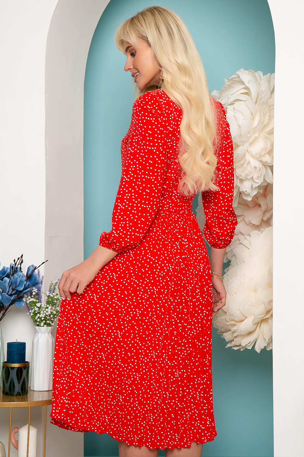 Долгожданный ХИТ продаж в новом исполнении! Летящее, манящее, женственное платье для самых утонченных натур. Плиссированная юбка длины миди,манящий красный цвет, принт в мелкий горошек - залог успешно созданного романтического образа. Талия отрезная, округлый вырез горловины. Рукав втачной, 7/8, низ на резинке. В комплекте поясок из основной ткани с пряжкой. Платье без подкладки, в боковом шве потайная молния.