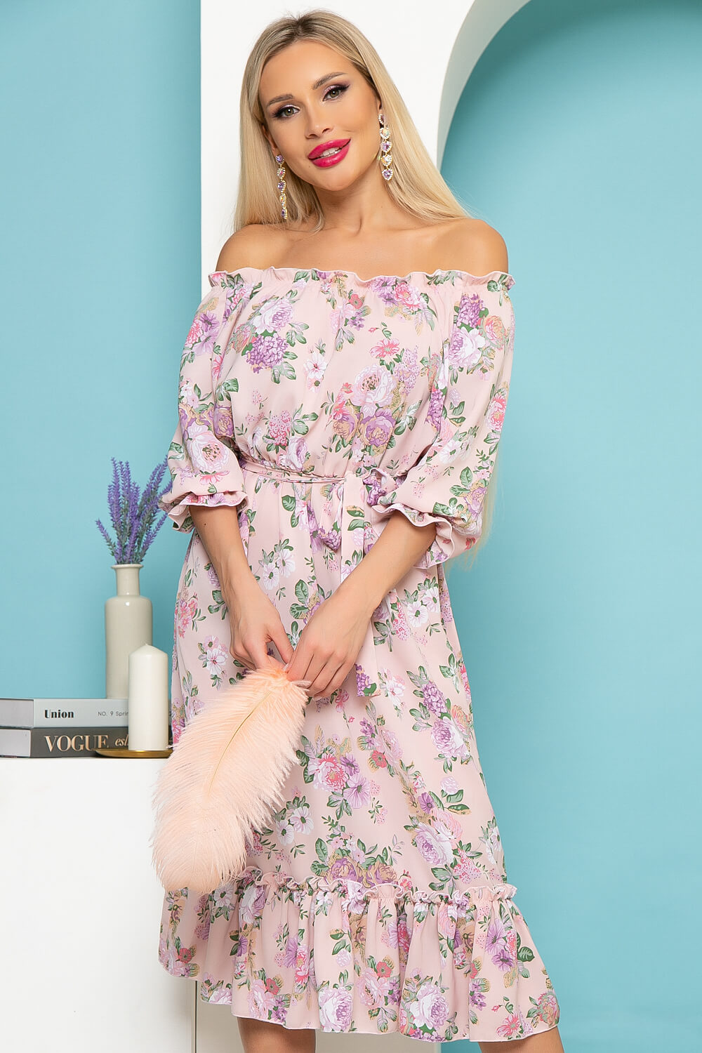 Как красиво! Такие платья освежают и создают лёгкий образ. Нежный и естественный рисунок на ткани порадует Вас и окружающих. Пышный рукав на резиночке и вырез горловины, который можно носить по-разному, спустив с обоих плеч, либо же игриво приоткрыв одно, придадут образу женственности. Платье средней длины, свободного кроя. Талия на резинке, низ платья украшает широкий волан. Платье без замков и подкладки. Пояс из основной ткани входит в комплект.