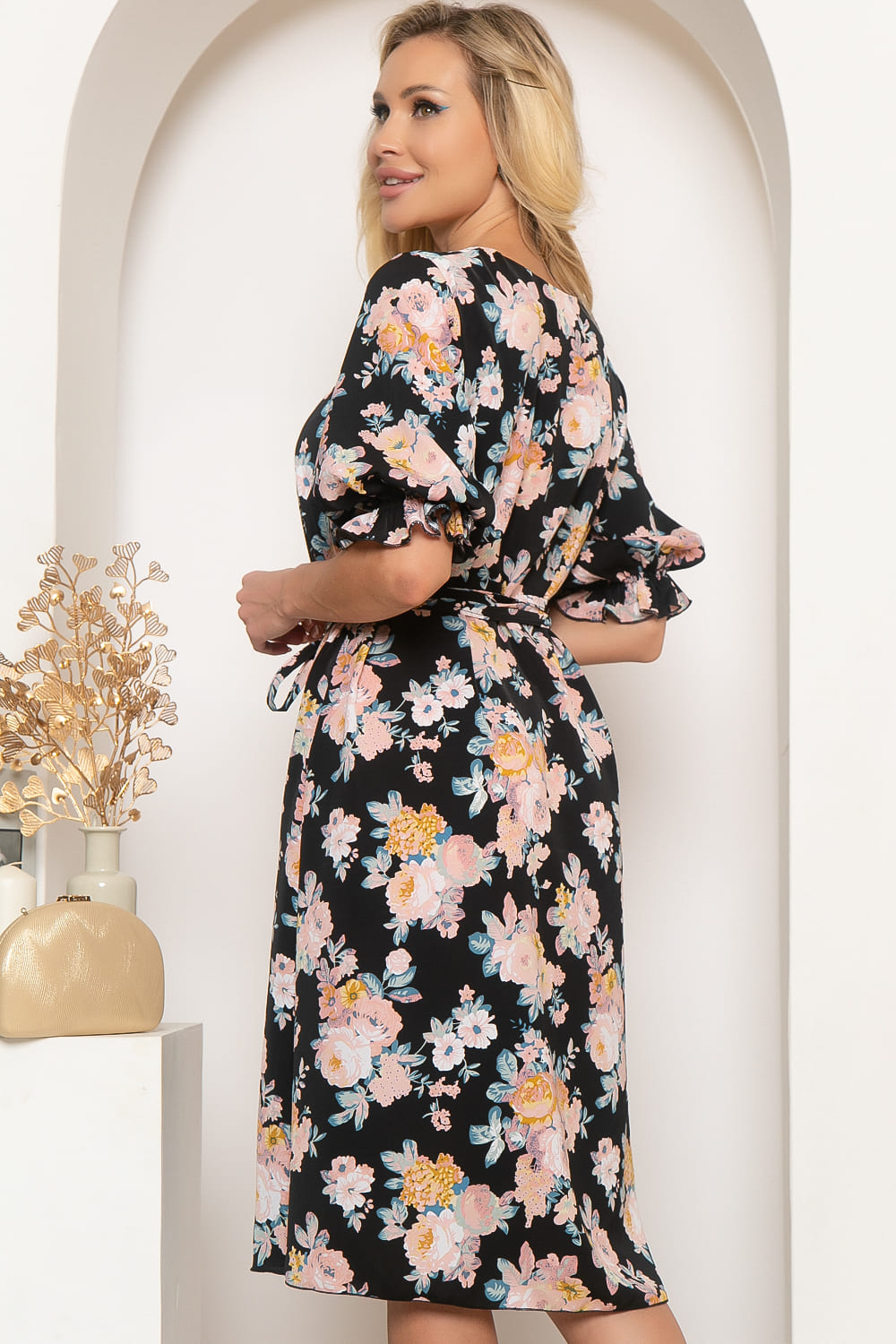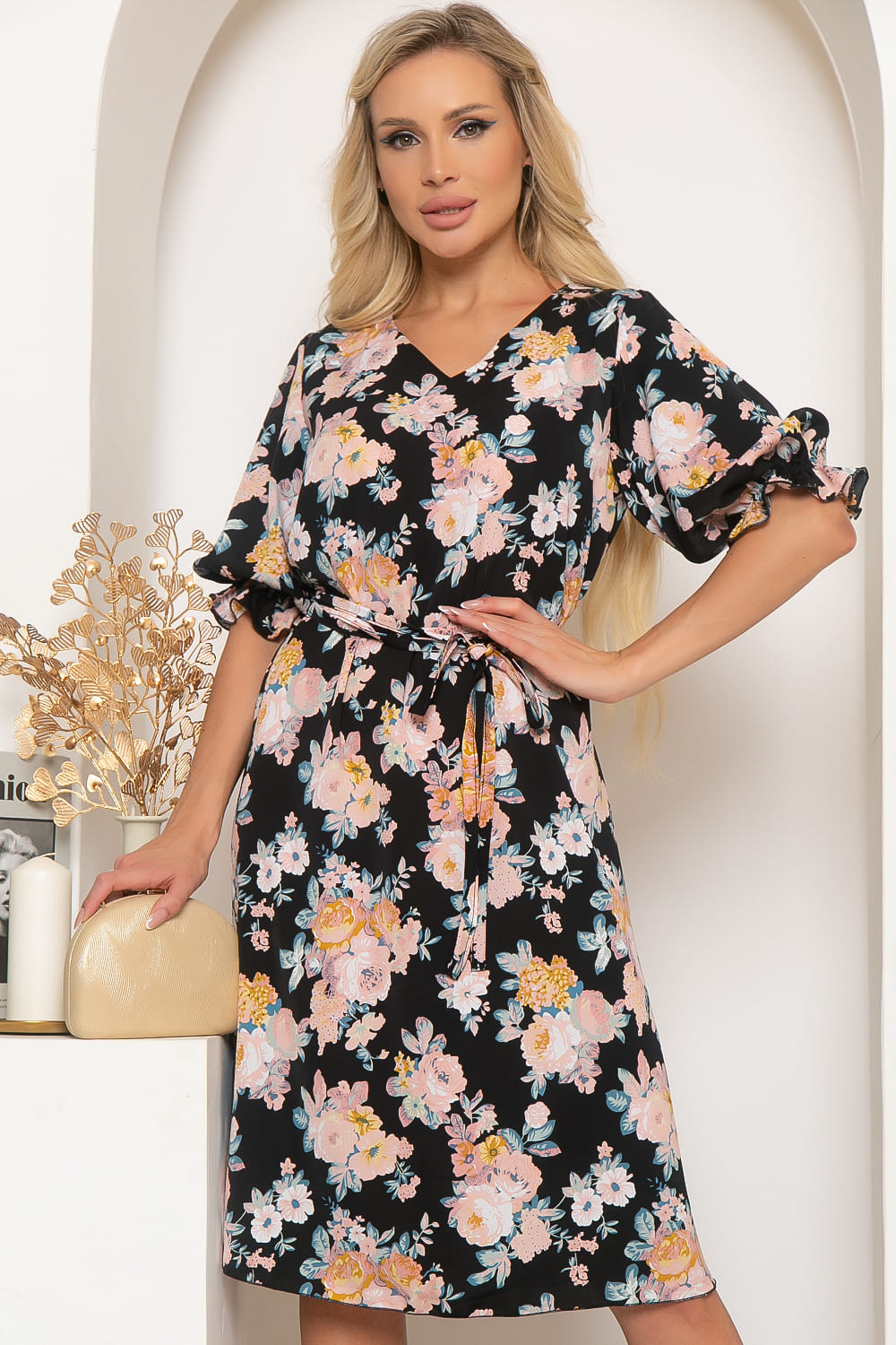 Изящное платье А - силуэта, с пояском в комплекте. Черный классический цвет изделия играет с ярким цветочным рисунком ткани. Свободный крой, V - образный вырез горловины. Рукав три четвертых, на шпульной резине по низу.