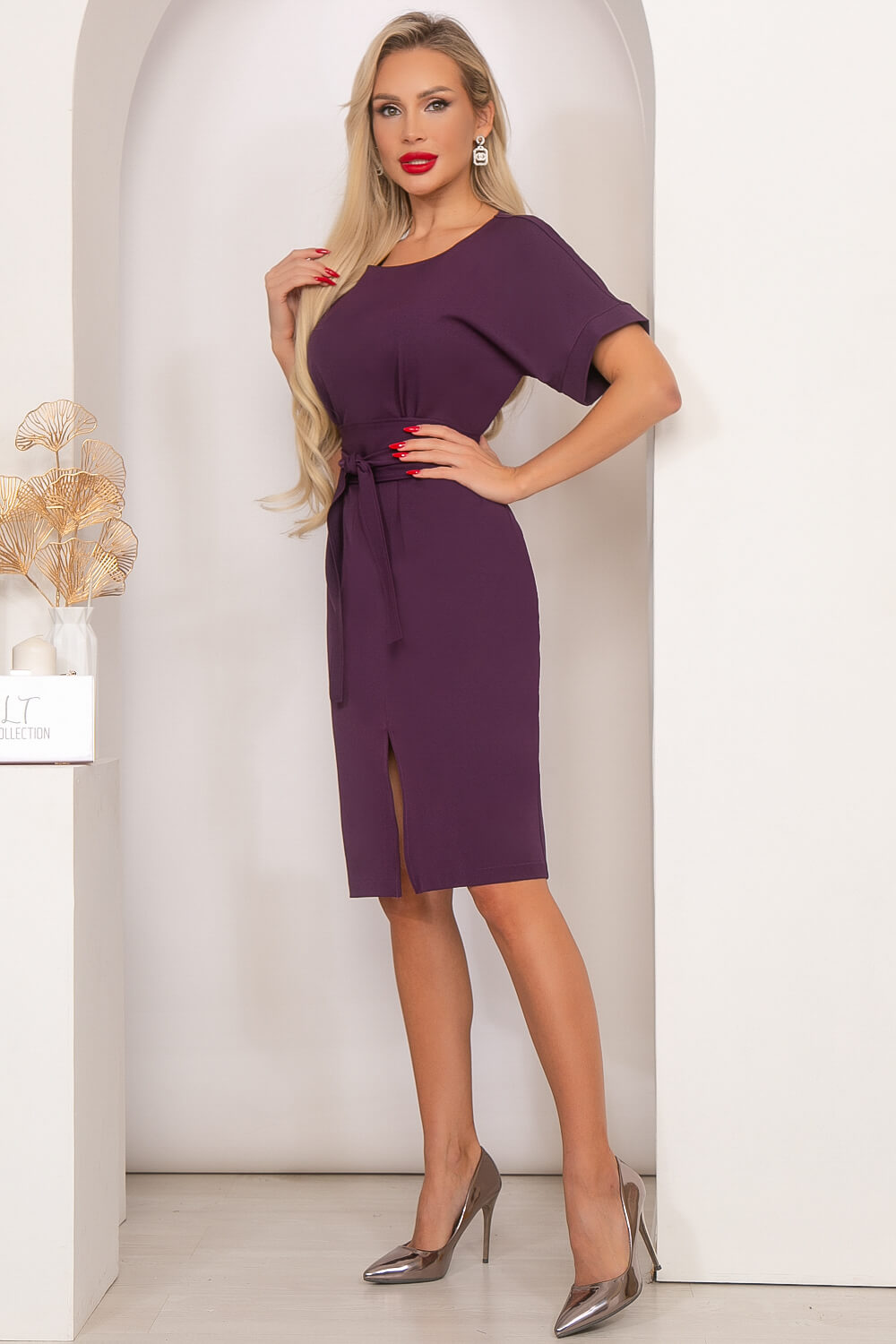 Элегантное платье в новом сливовом оттенке подчеркнёт Вашу женственность, а его интересный крой расставит грамотные акценты в образе. Платье полуприлегающего силуэта, по переду защипы в области груди и талии, юбка разрезная по переду с деликатным разрезом, приоткрывающим ножки. Рукав укороченный, с манжетом. В комплекте пояс-кушак, позволяющий красиво подчеркнуть талию.