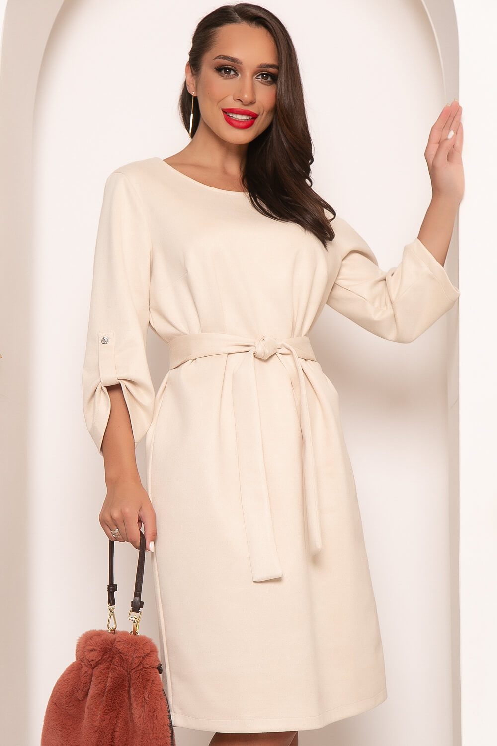 Замшевое платье средней длины на каждый день. Эта базовая модель собрала в себе все тренды этого года. При этом в числе модных тенденций этого сезона присутствуют минимализм, женственность и комфорт, которые так удачно сочетаются в этом платье. А замша, как нельзя лучше подходит для прохладных осенних дней. В комплекте пояс из основной ткани.