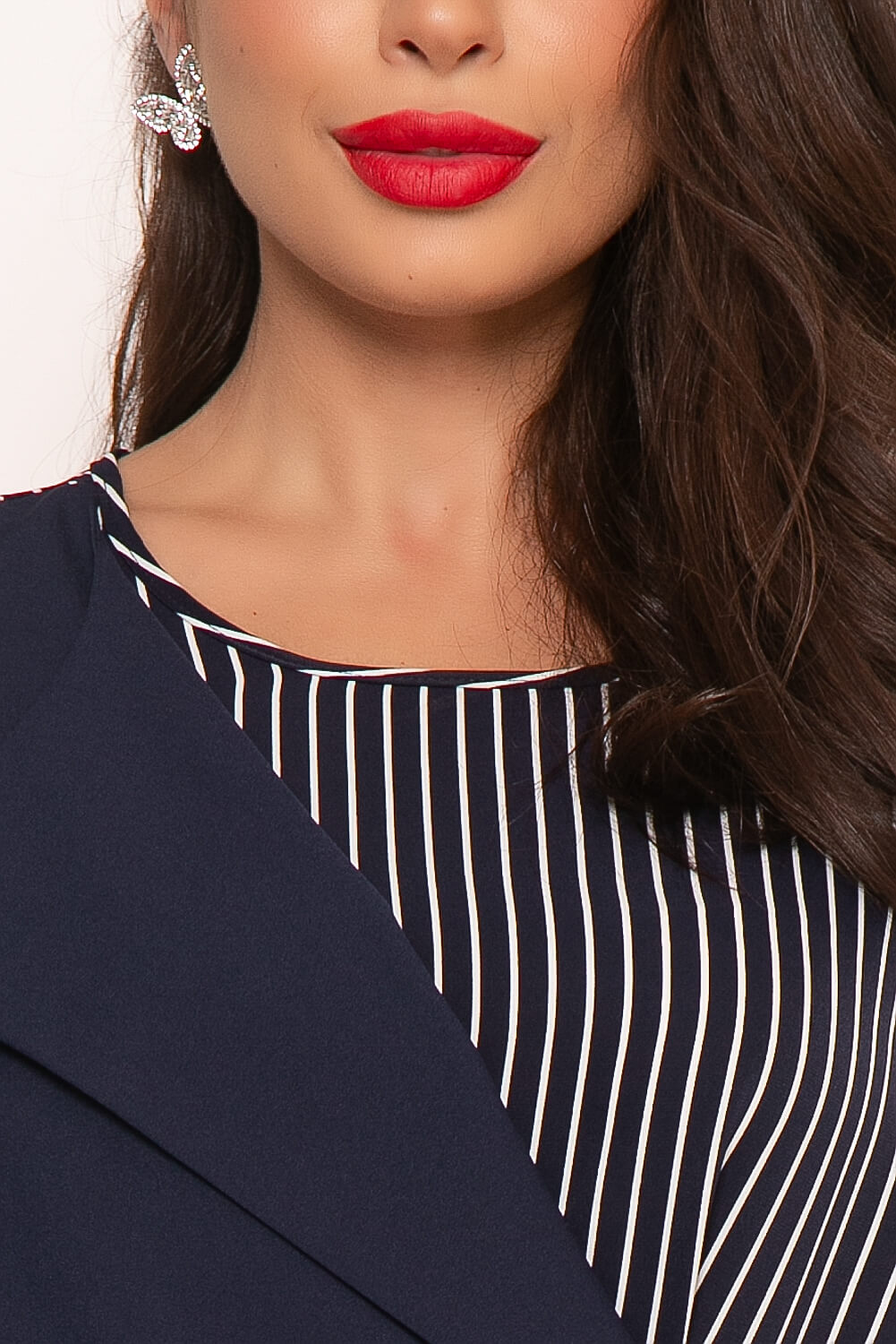 Платье с ассиметричным верхом в классическом стиле идеально разнообразит Ваш офисный образ. Платье выполнено из комбинированных материалов приятных к телу. Верхняя часть выполнена с имитацией блузы с коротким втачным рукавом. Округлый вырез горловины, по спинке застегивается на застёжку "петля-пуговица". В боковом шве есть потайная молния. Платье приталенного силуэта, в боковых швах расположены карманы, сзади на юбке шлица. В комплекте пояс с пластиковой пряжкой.