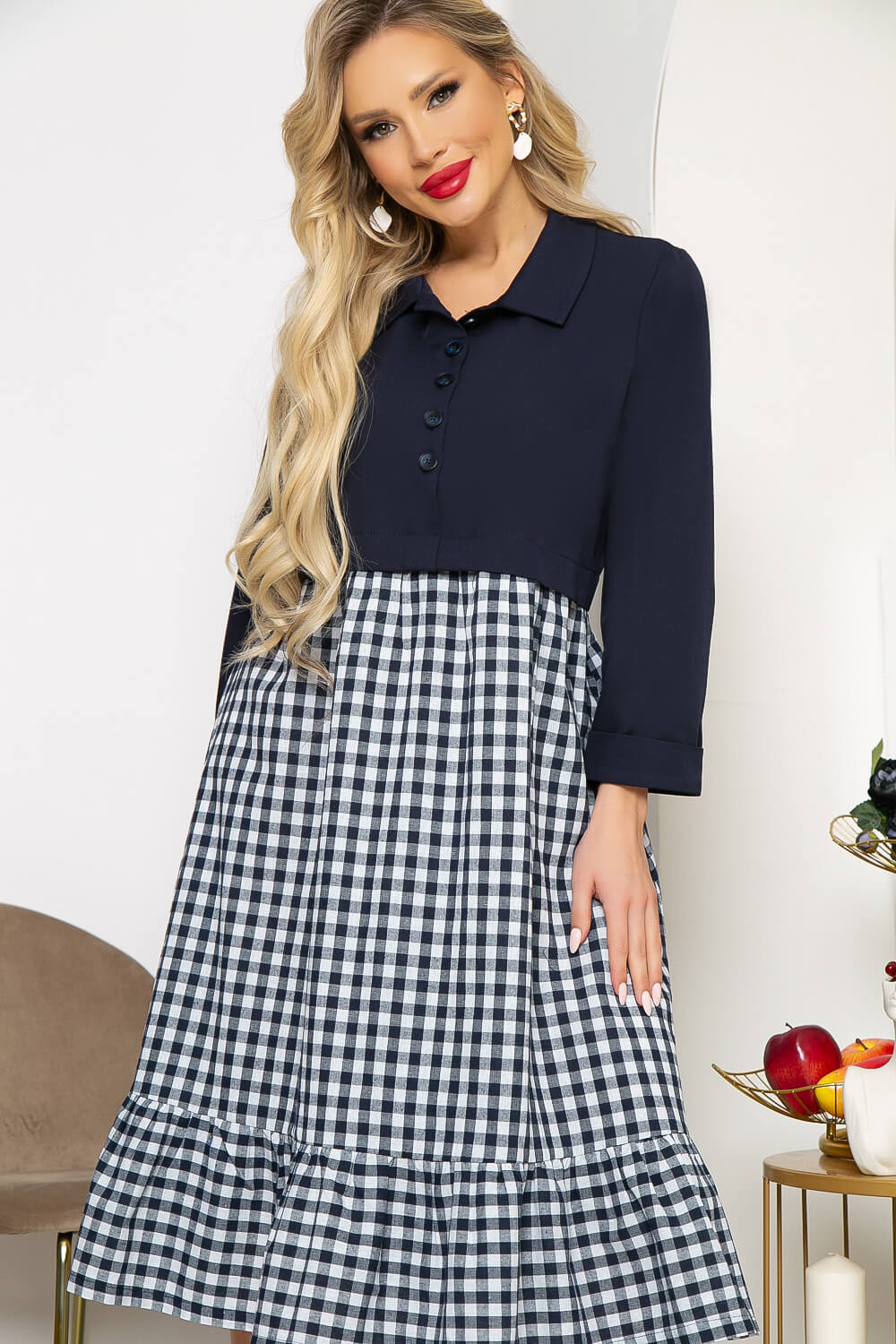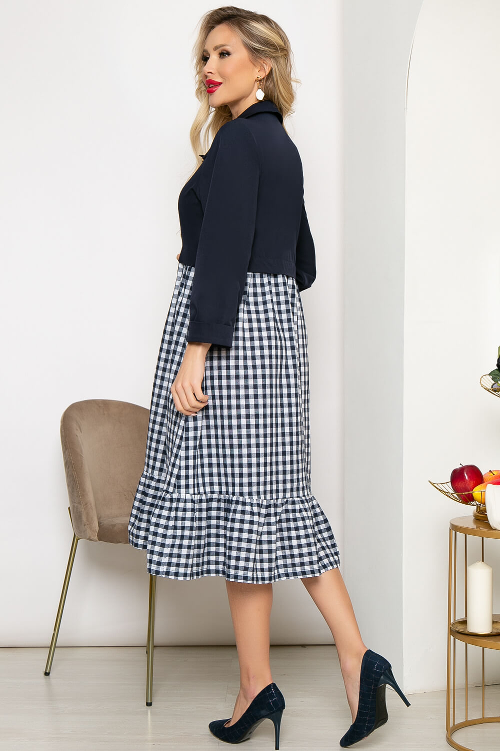 Низ платья - юбка с широким воланом. В боковых швах карманы. Рукав втачной, на мажете.